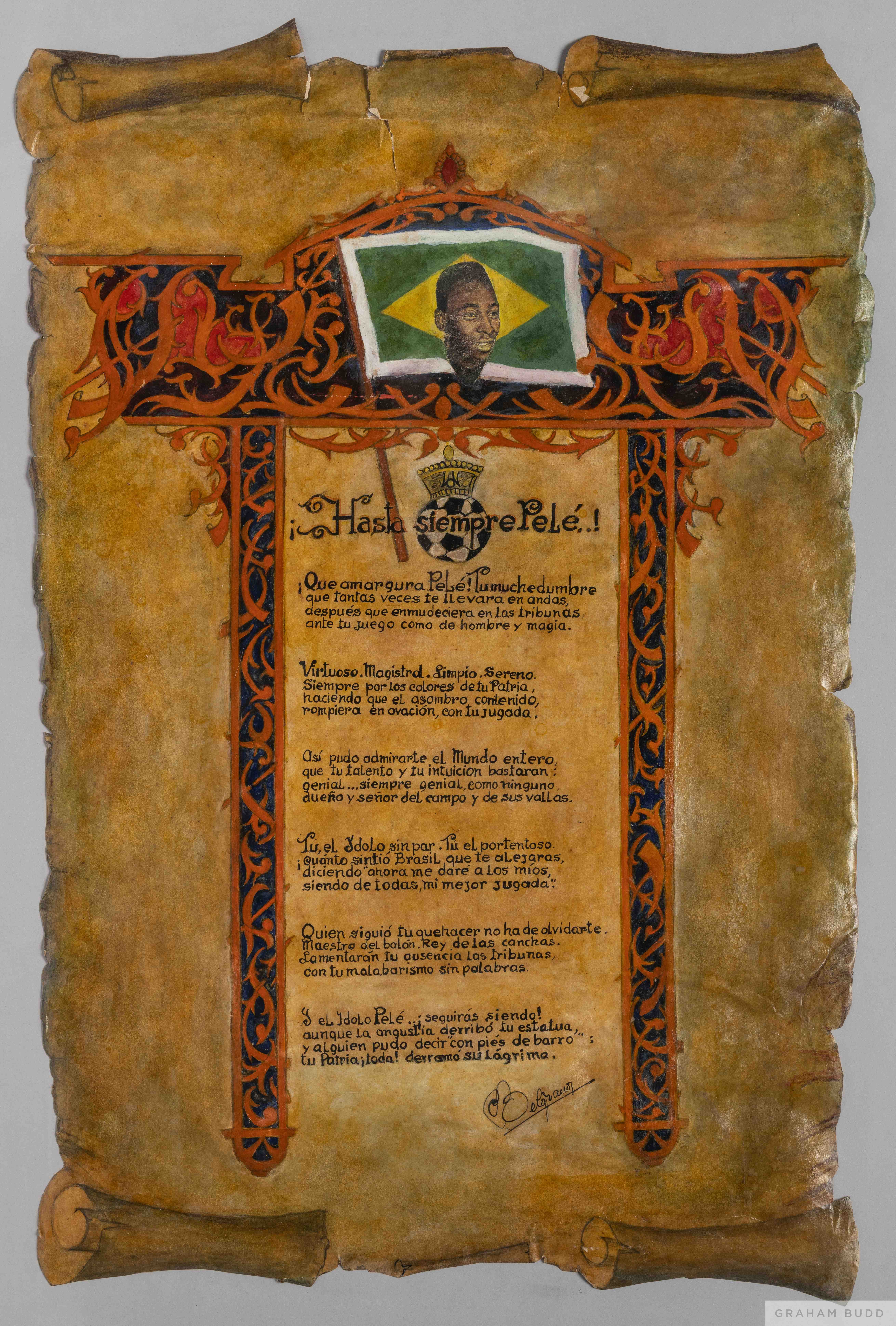 A tribute poem presented to Pelé on heavy ornamented parchment, the poem is signed by the author.23 by 15 1/2 inches PROVENANCE: The Pele Collecti