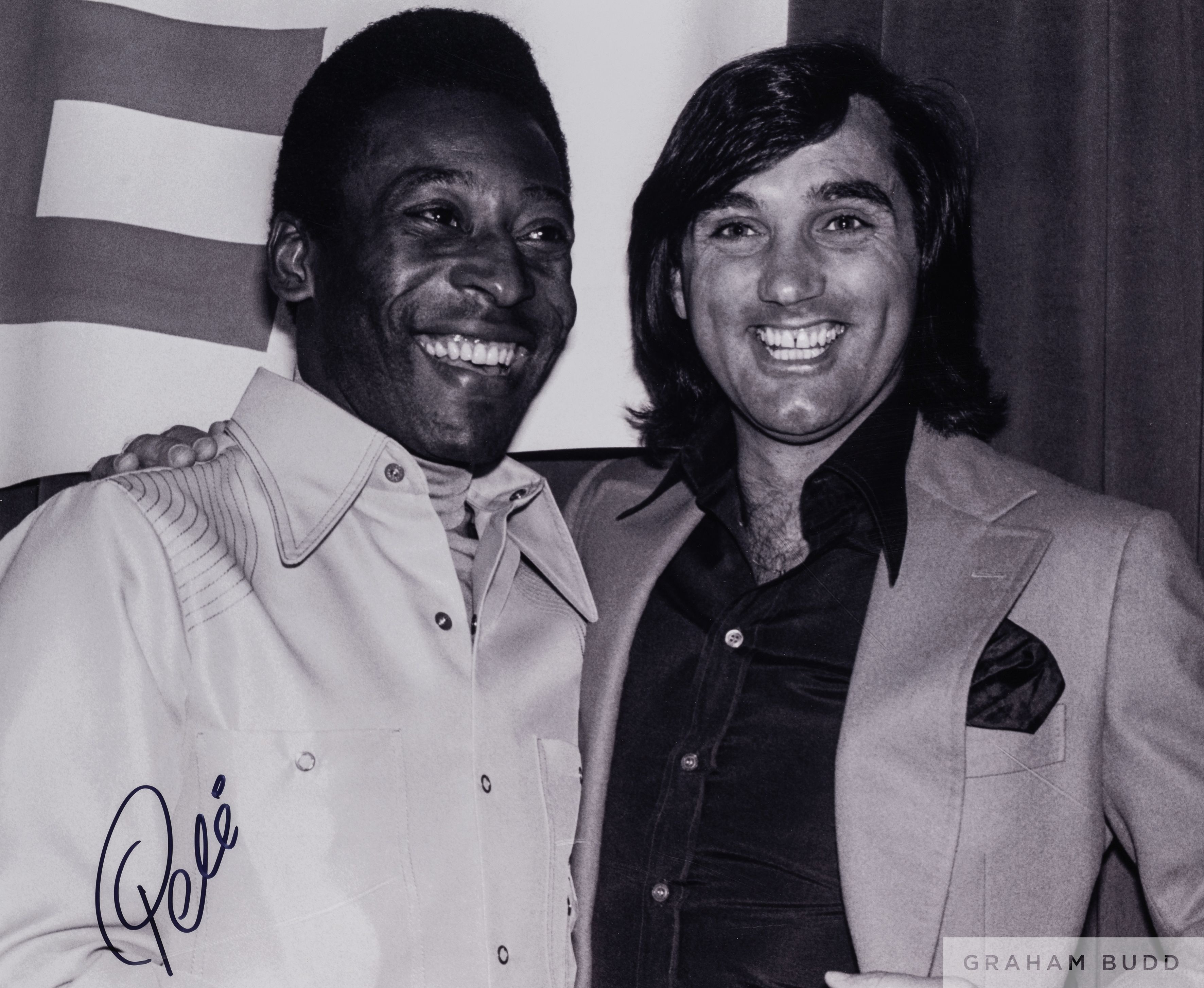 A large black and white portrait photograph of Pele and George Best, signed in black marker pen on the front by Pele and accompanied by a certificate of authenticity from Sporting Memorabilia,co.uk and signed by Director Terry Baker and measuring 23.5cm x 27.5cm.