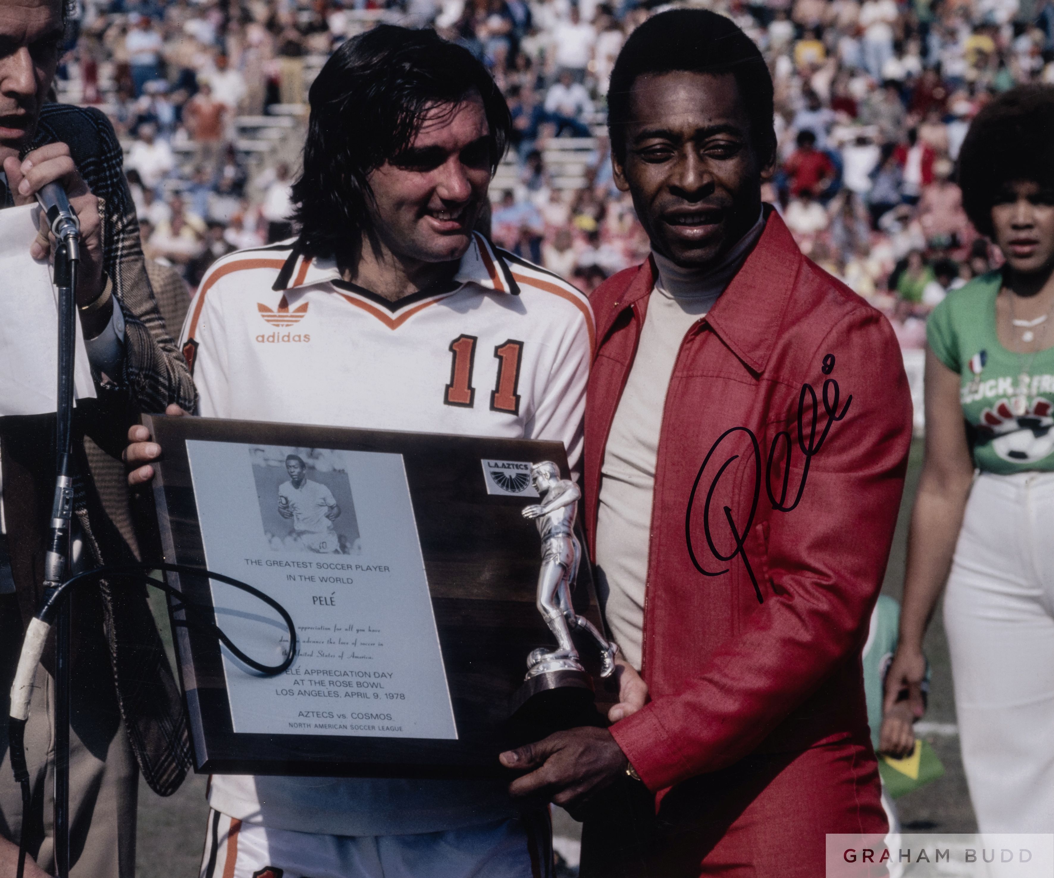 A large colour portrait photograph of Pele and George Best, signed in black marker pen on the front and accompanied by a certificate of authenticity