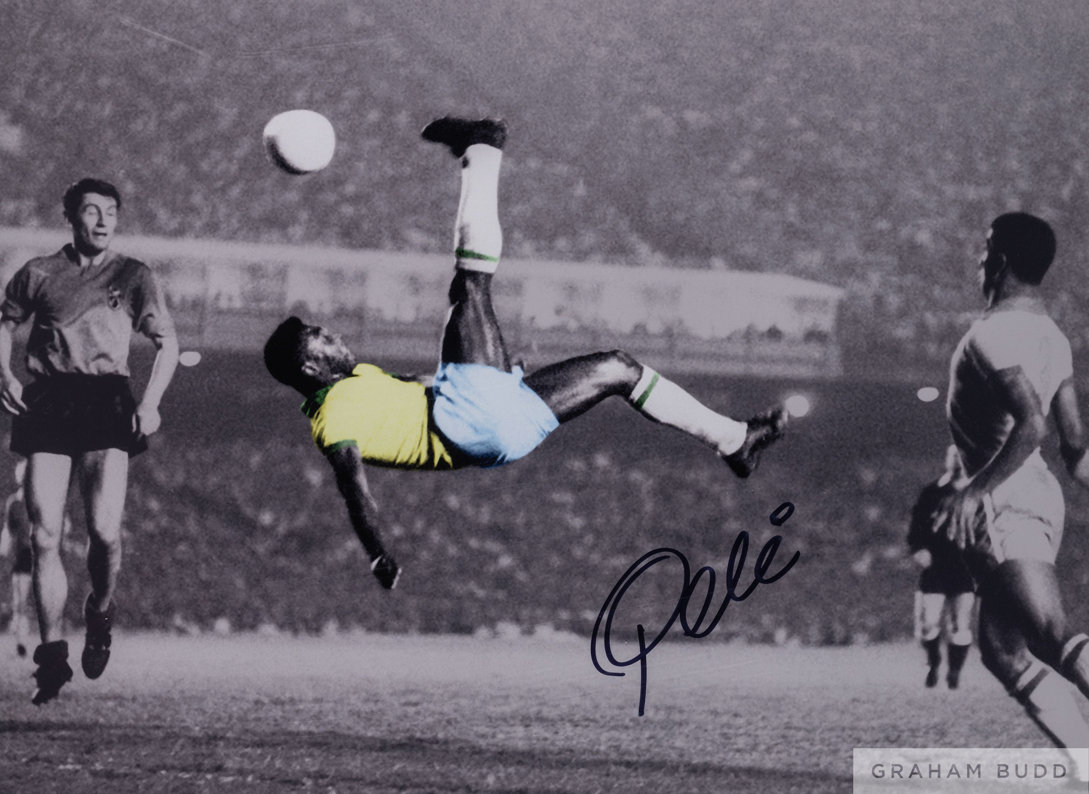 A large colour and black and white portrait photograph of Pele, signed in black marker pen on the front by Pele and accompanied by a certificate of authenticity from Sporting Memorabilia.co.uk, signed by Director Terry Baker and measuring 46cm x 59cm.