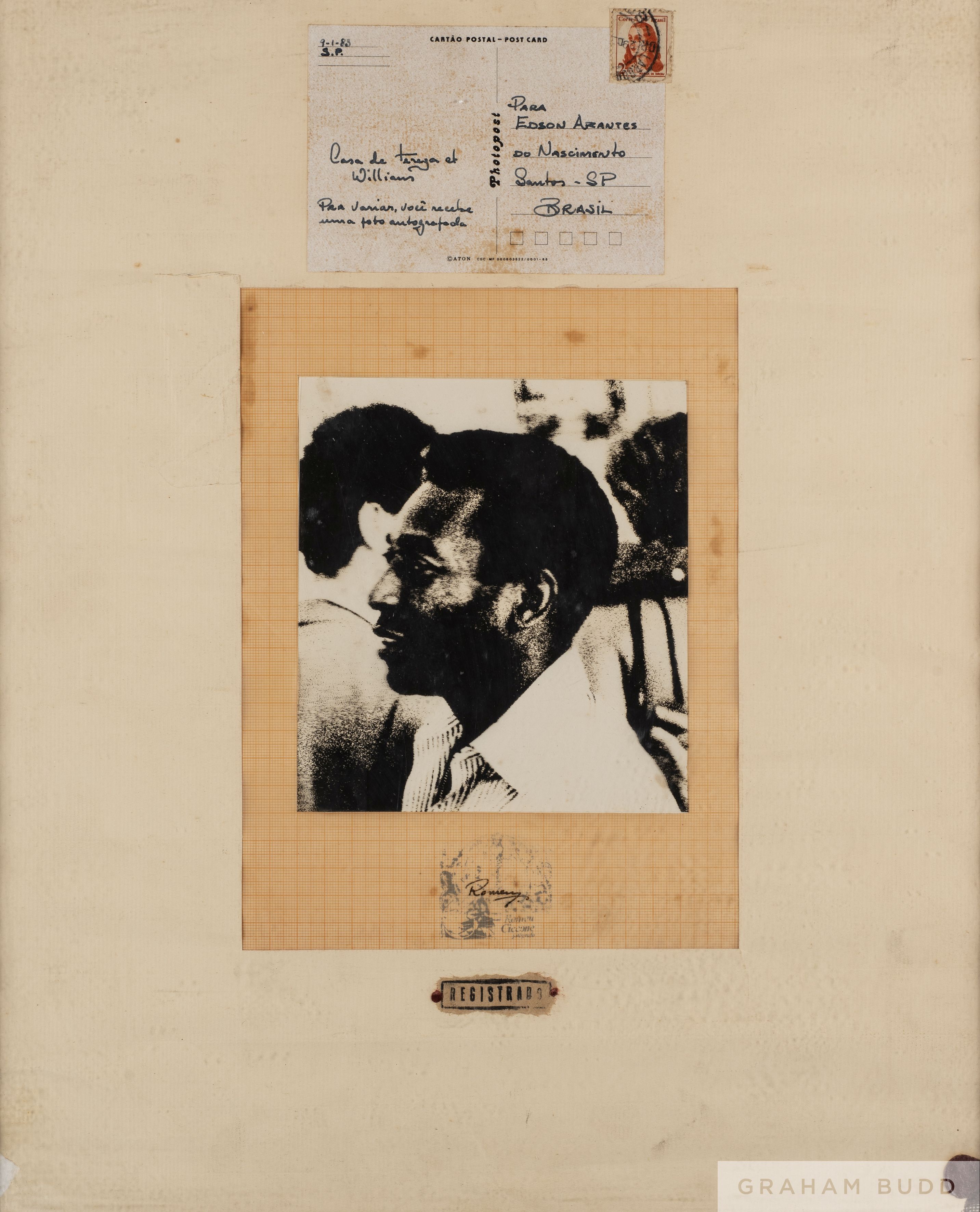 A framed collage featuring a screen-print portrait of Pelé, on a paper-backed transparent sheet below a postcard addressed from Casa de Tereza et Williams. The screen-print is stamp-signed “Romeu Ciccone, Fotografo.” PROVENANCE: The Pele Collection, Julien's Auctions, June 2016 Lot No.728