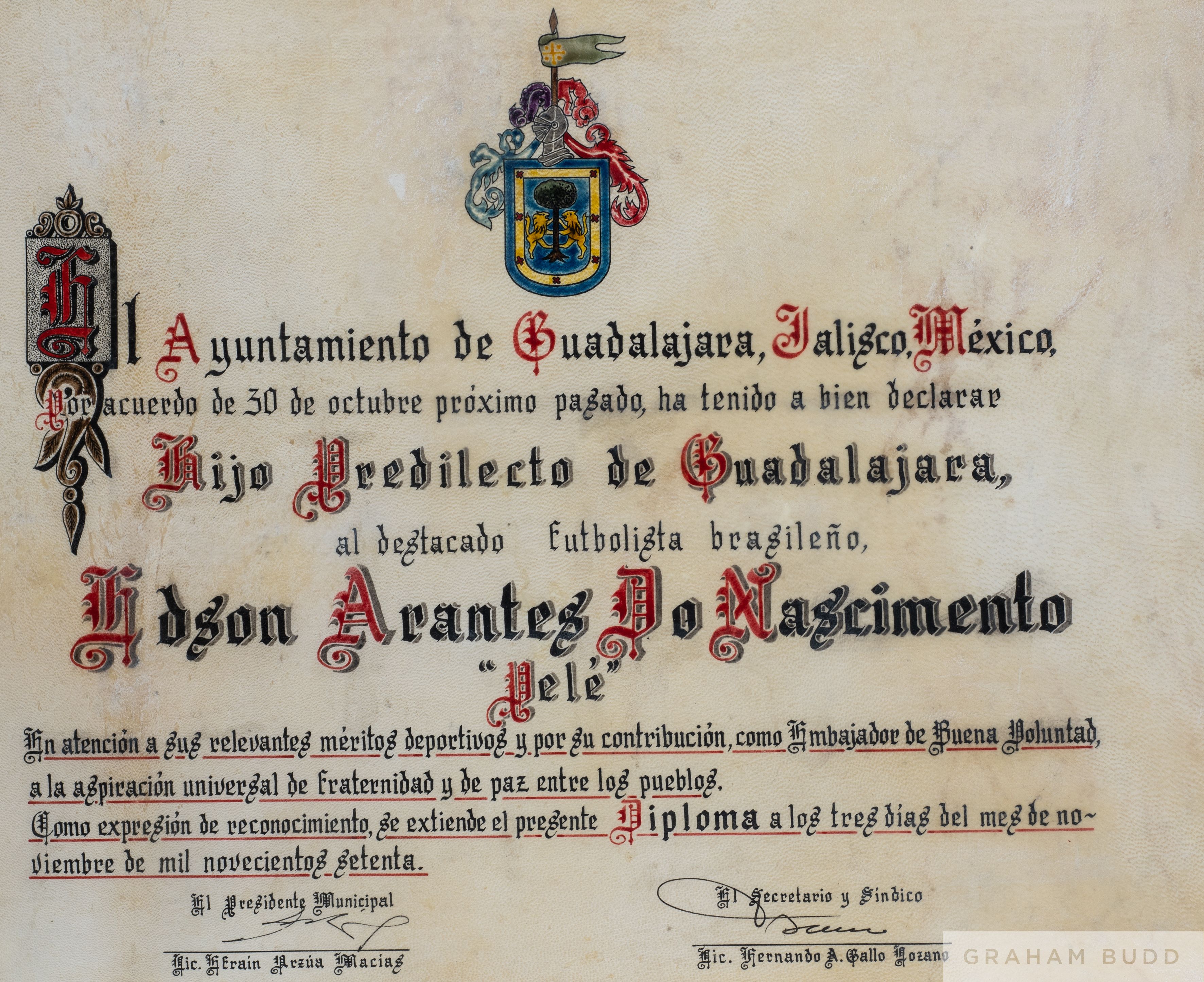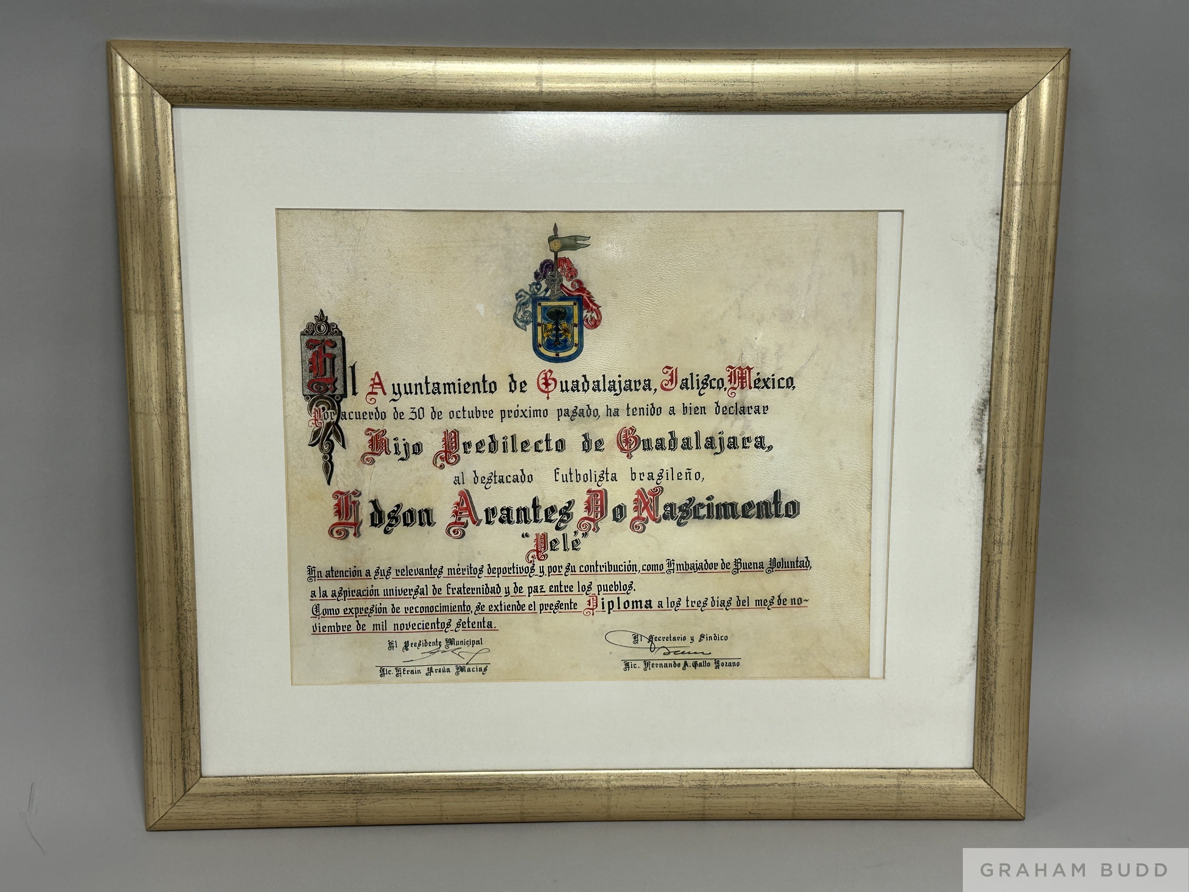A framed certificate of merit, hand drawn on vellum, presented to Pelé, in recognition of his skills as a football player by the city of Guadalajara, Jalisco, Mexico. 28 1/4 by 24 1/4 inches, overall PROVENANCE: The Pele Collection, Julien's Auctions, June 2016 Lot No.1163
