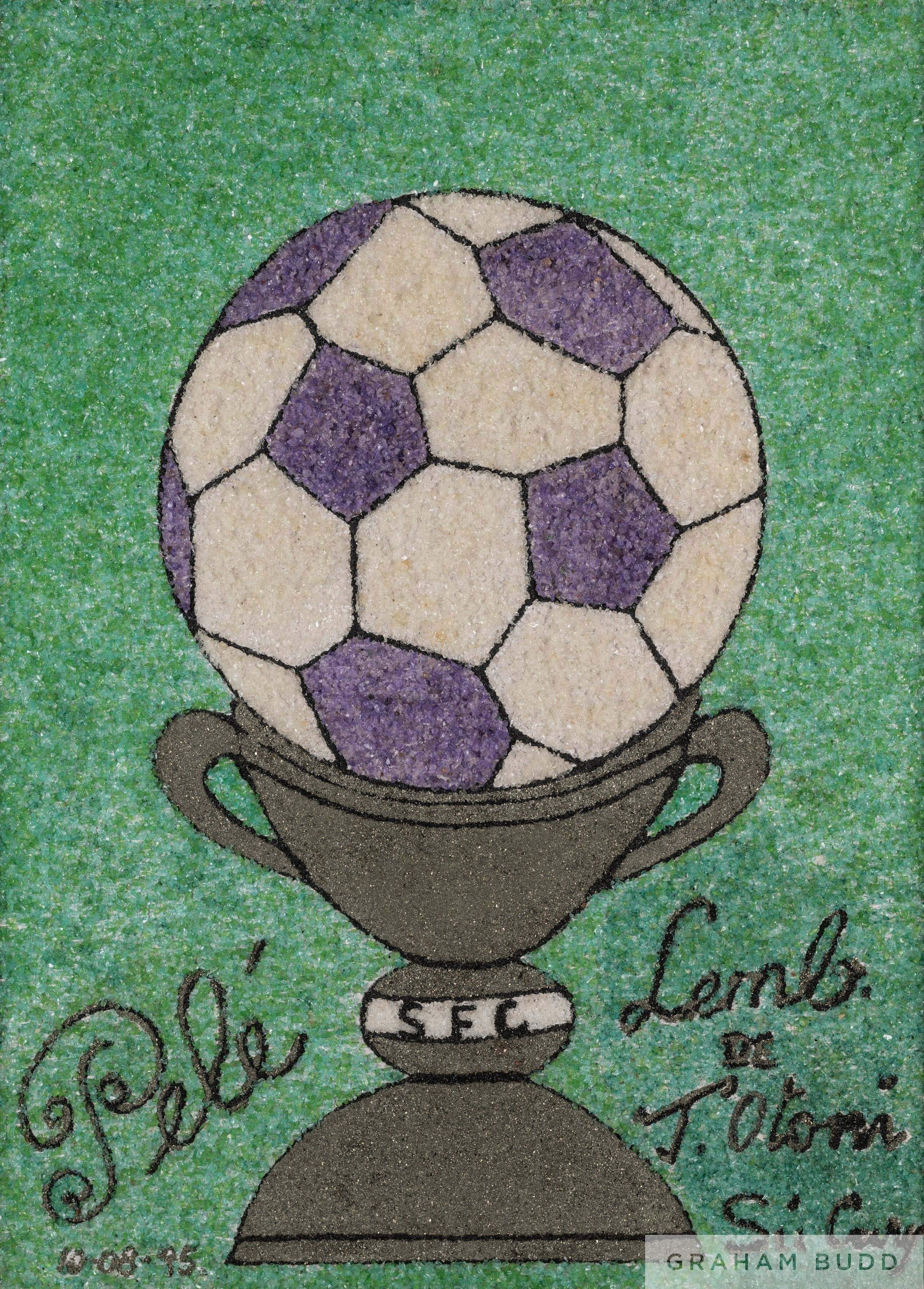 A piece of artwork titled "Souvenir of T. Otoni" owned by Pelé. Téofilo Otoni is a city in northeast Minas Gerais, Brazil. The green, purple, white, black and gold coloured painting features a soccer ball seated in the Jules Rimet World Cup with lettering on the left that reads "Pelé" and on the right that reads "Lemb de T. Otoni" [Souvenir of T. Otoni]. The painting is dated 1995. Framed. 25 3/16 by 18 7/8 inches, overall PROVENANCE: The Pele Collection, Julien's Auctions, June 2016 Lot No.73