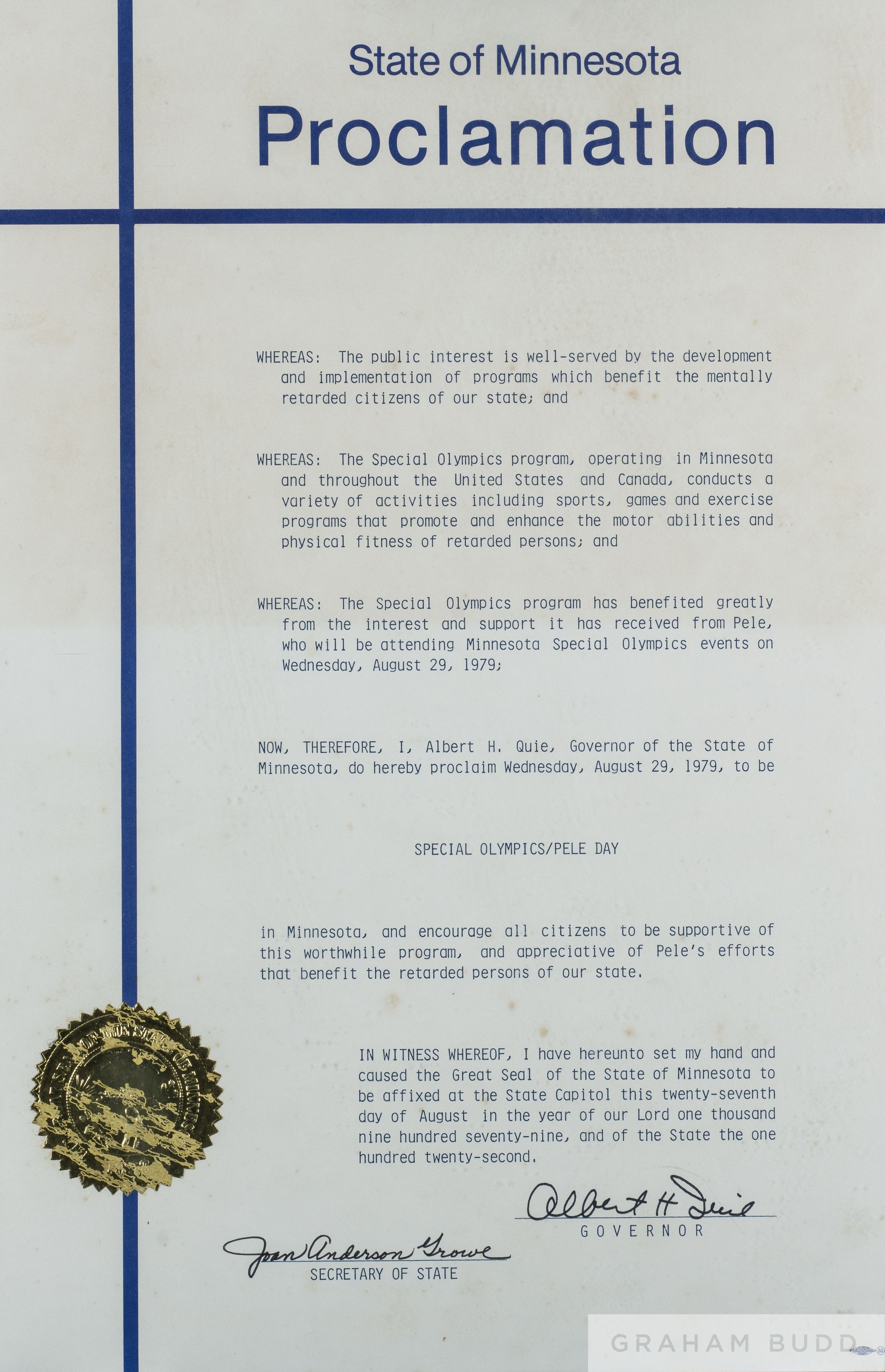 A proclamation presented to Pelé in 1979 by then Minnesota Governor Albert H. Quie, marking August 29, 1979, as "Special Olympics/Pelé Day." The paper proclamation is signed in black ink by the governor and features an affixed gold coloured "Seal of the State of Minnesota." Framed.22 3/4 by 16 7/8 inches. PROVENANCE: The Pele Collection, Julien's Auctions, June 2016 Lot No.130