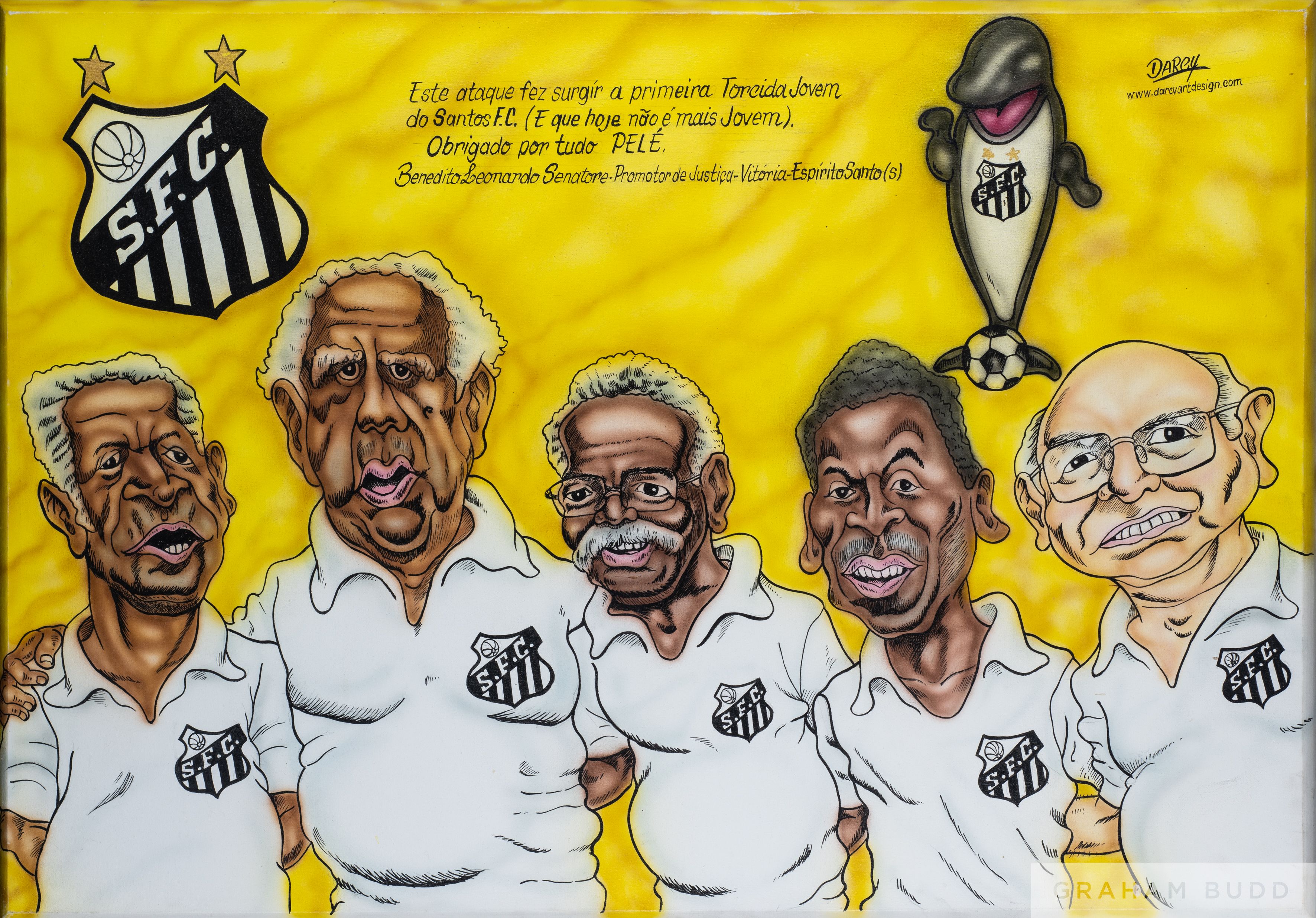 A framed aerosol on canvas caricature of Pelé along with other famous Santos FC players, inscribed "Este ataque fez surgir a primeira Torcida Jovem