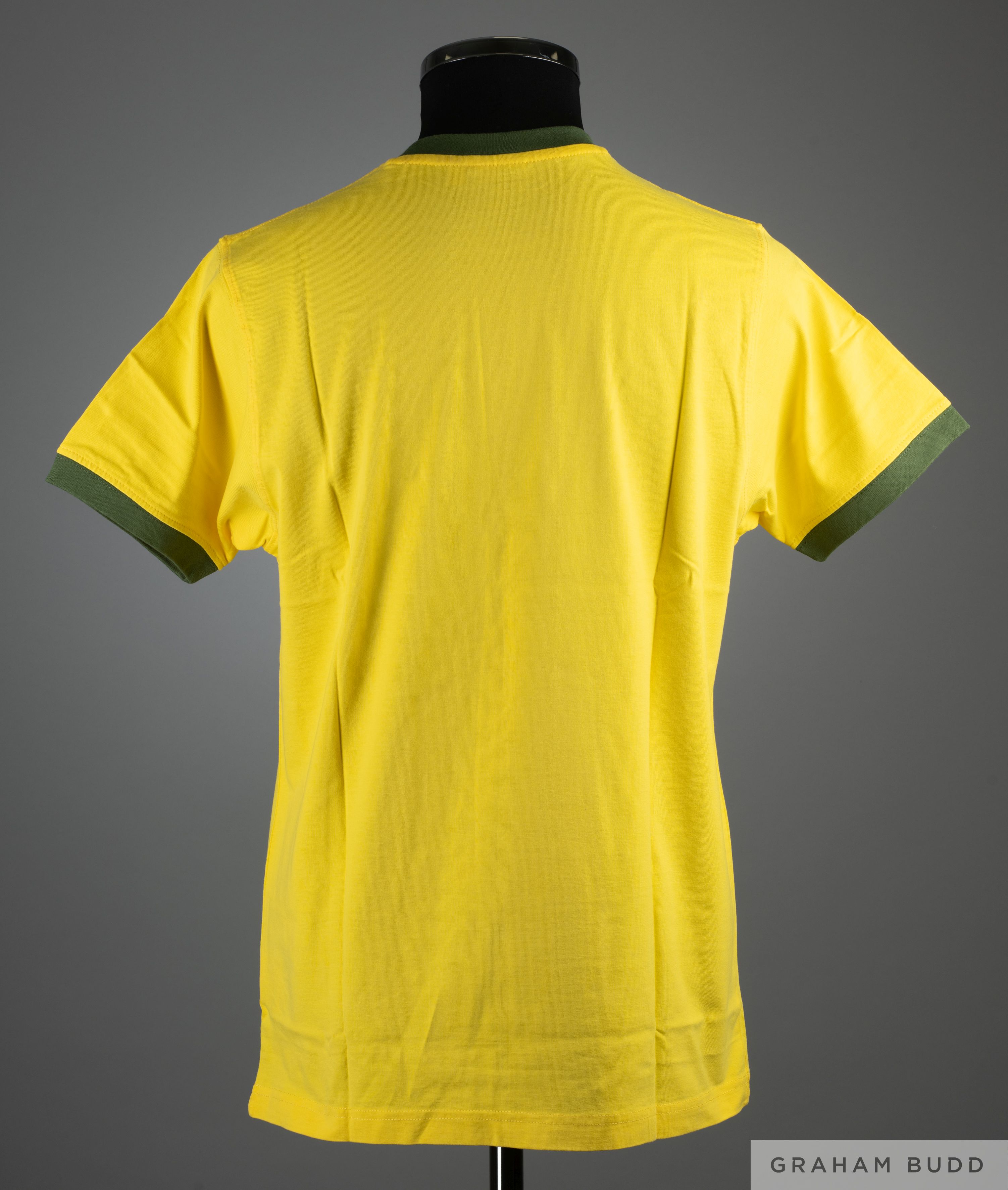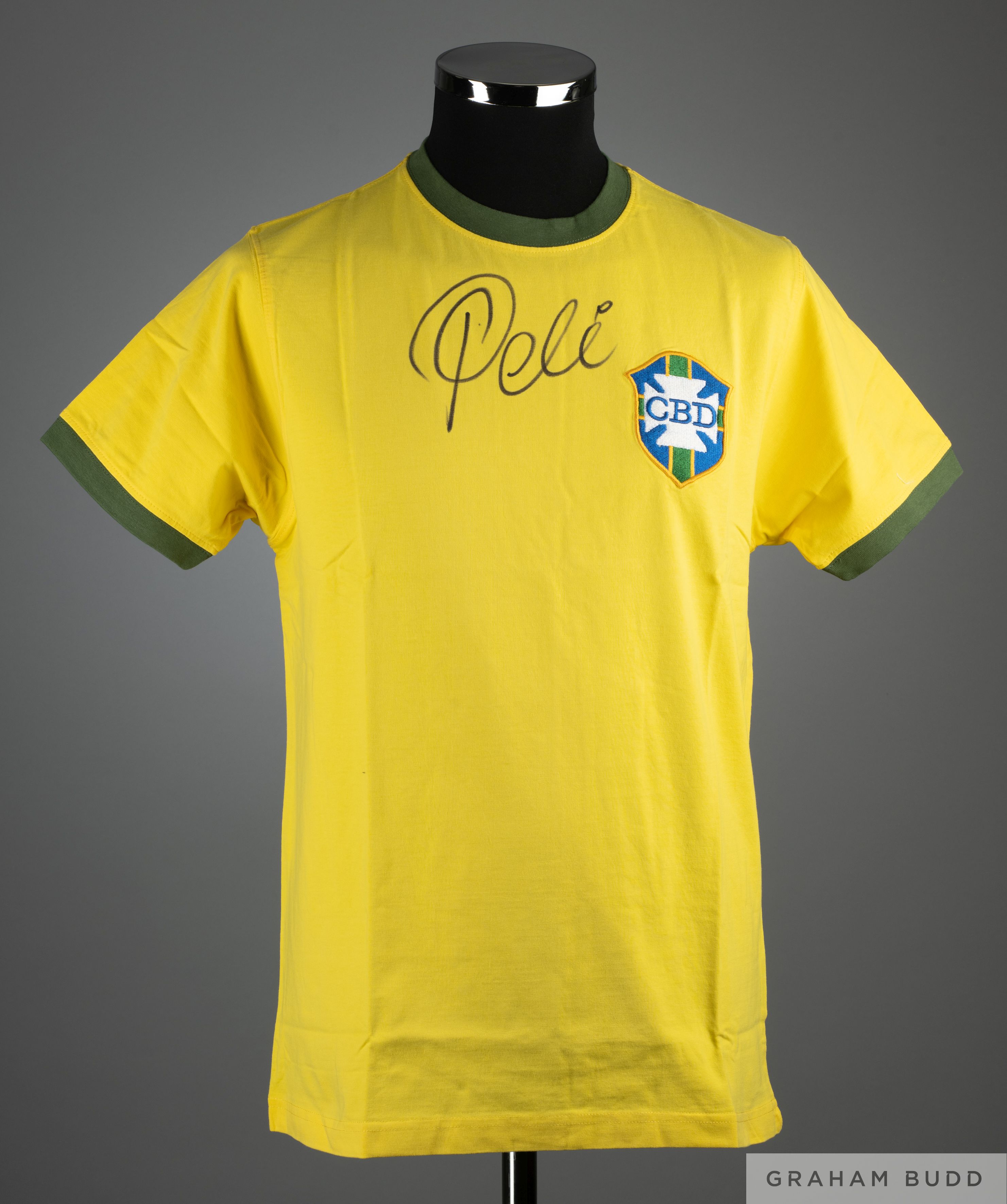A replica Brazil shirt autographed by Pele with COA from Sporting Memorabilia.co.uk signed by Terry Baker