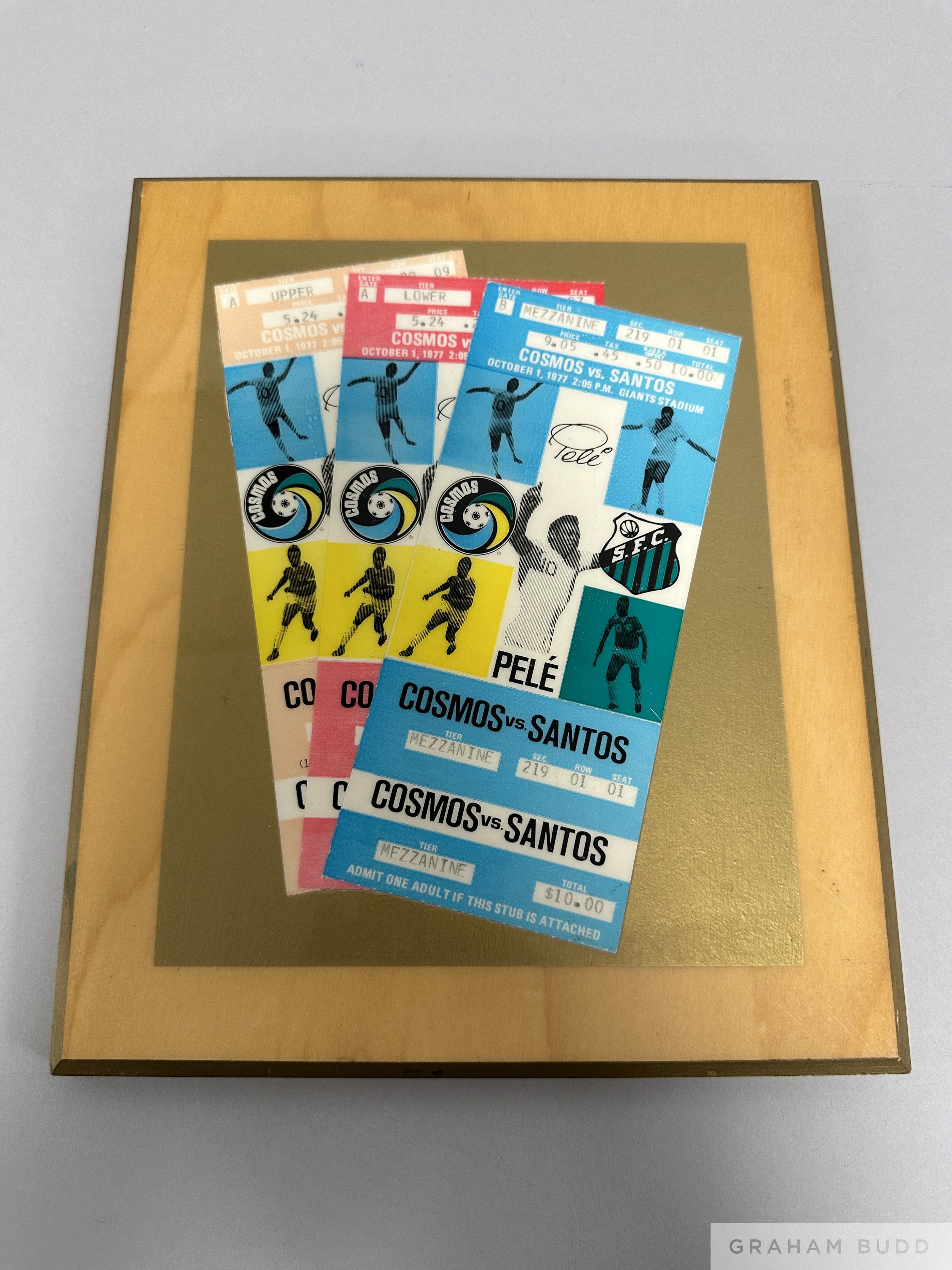 Pele Farewell Match tickets presentation, a laminated wooden frame enclosing a trio of match tickets for the Cosmos v Santos Pele Farewell Match played at the Giants Stadium 1st October 1977, one ticket from each tier of the stadium seating (lower, mezzanine, & upper) Provenance: The Charles Martinelli Collection. Former Equipment Manager of the New York Cosmos.