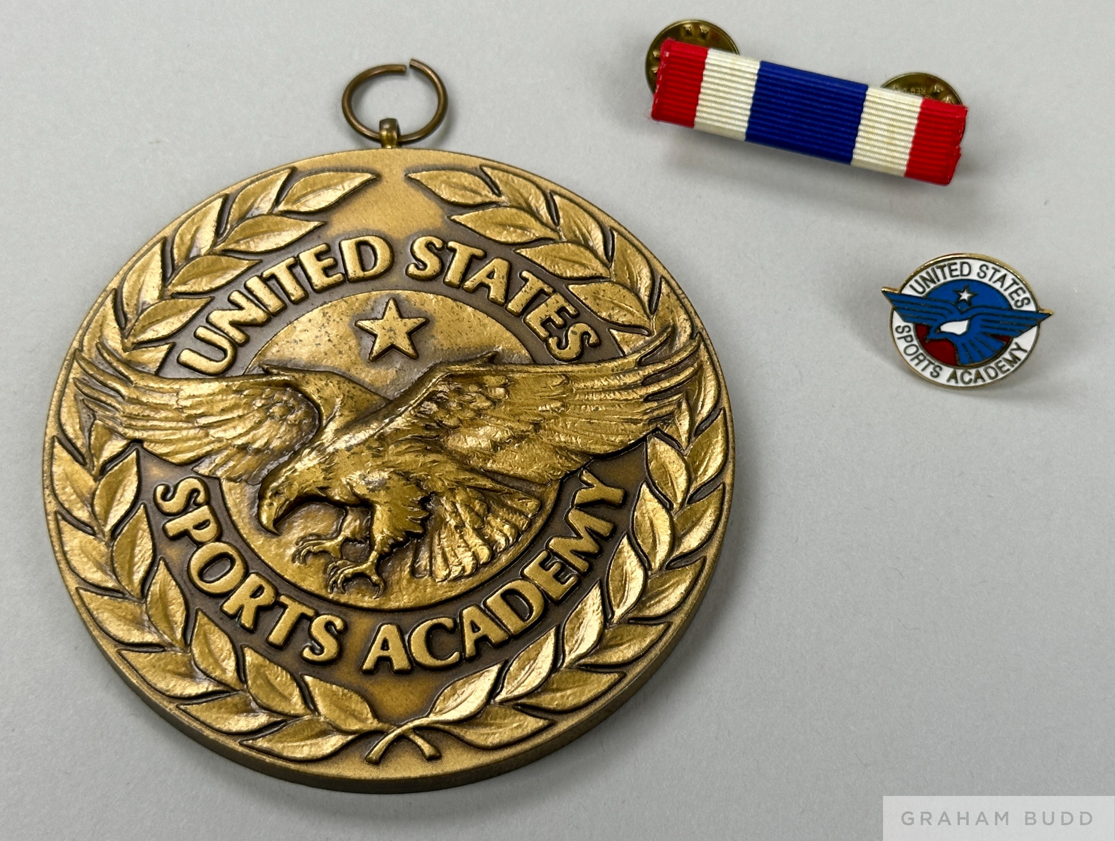 A bronze tone medallion, cloth colour bar, and enamel pin presented to Pelé by the United States Sports Academy in 1994. The front of the medal features the academy's eagle emblem framed by laurels. The back of the medal is engraved "Edson Arantes do Nascimento (Pelé)/ Professional Soccer." Diameter, 2 15/16 inches, (3) PROVENANCE: The Pele Collection, Julien's Auctions, June 2016, Lot 77