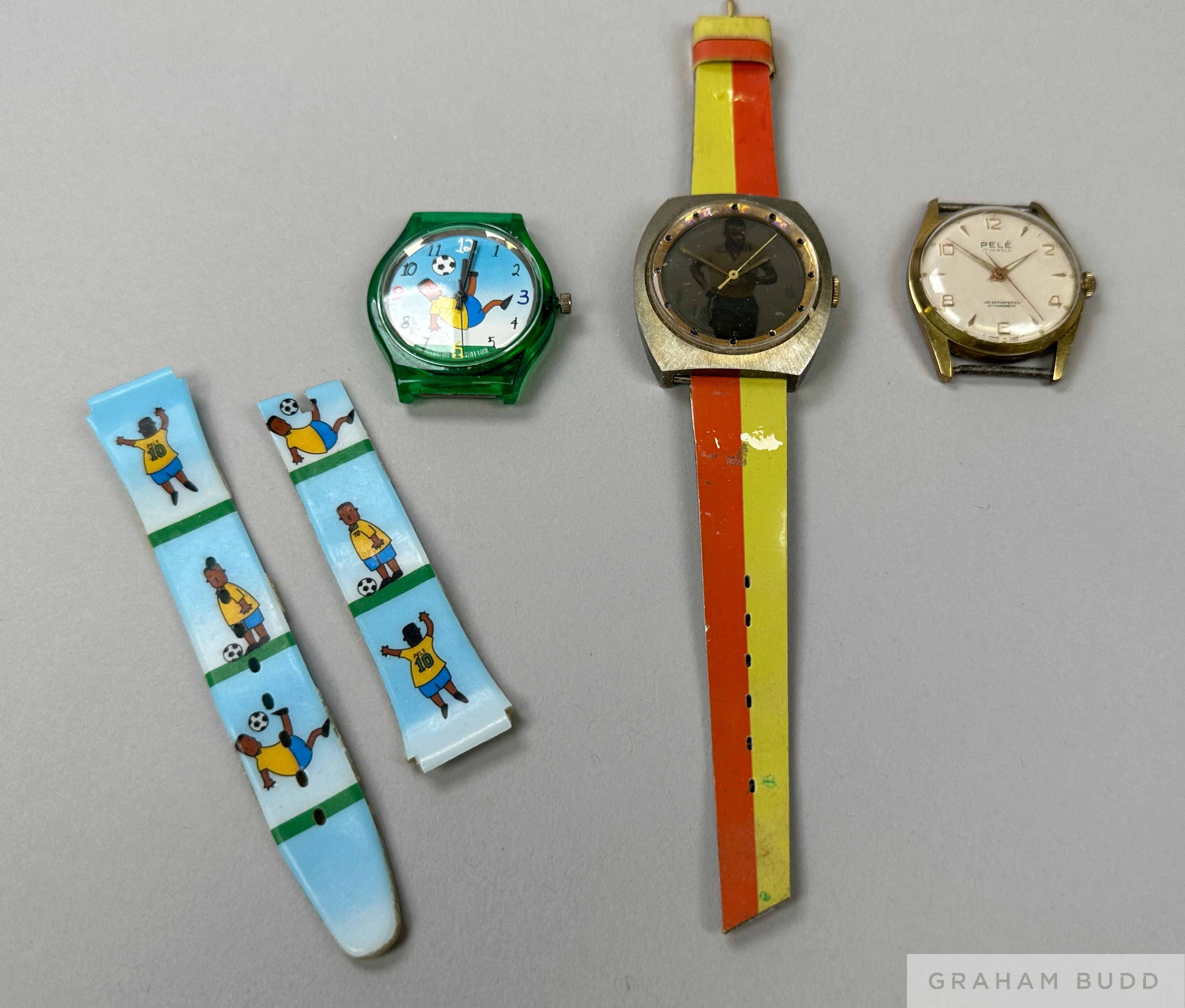 A group of three watches commemorating Pelé. The first is a watch with a round dial marked "Pelé 17 Jewels," no strap. The second is an unmarked watch with an image of Pelé in the Brazilian football uniform on the watch face, with an orange and yellow striped plastic strap. The third has a cartoon of a man wearing Pelé's jersey with a football on the face and broken straps. The watch face reads "In God we Trust TVM 1998," and the back of the straps read "Pelé - L' Athlete du Siécle" [Pelé - Athlete of the Century]. Some damage and disintegration. Not working or tested. PROVENANCE: The Pele Collection, Julien's Auctions, June 2016, Lot No.1406