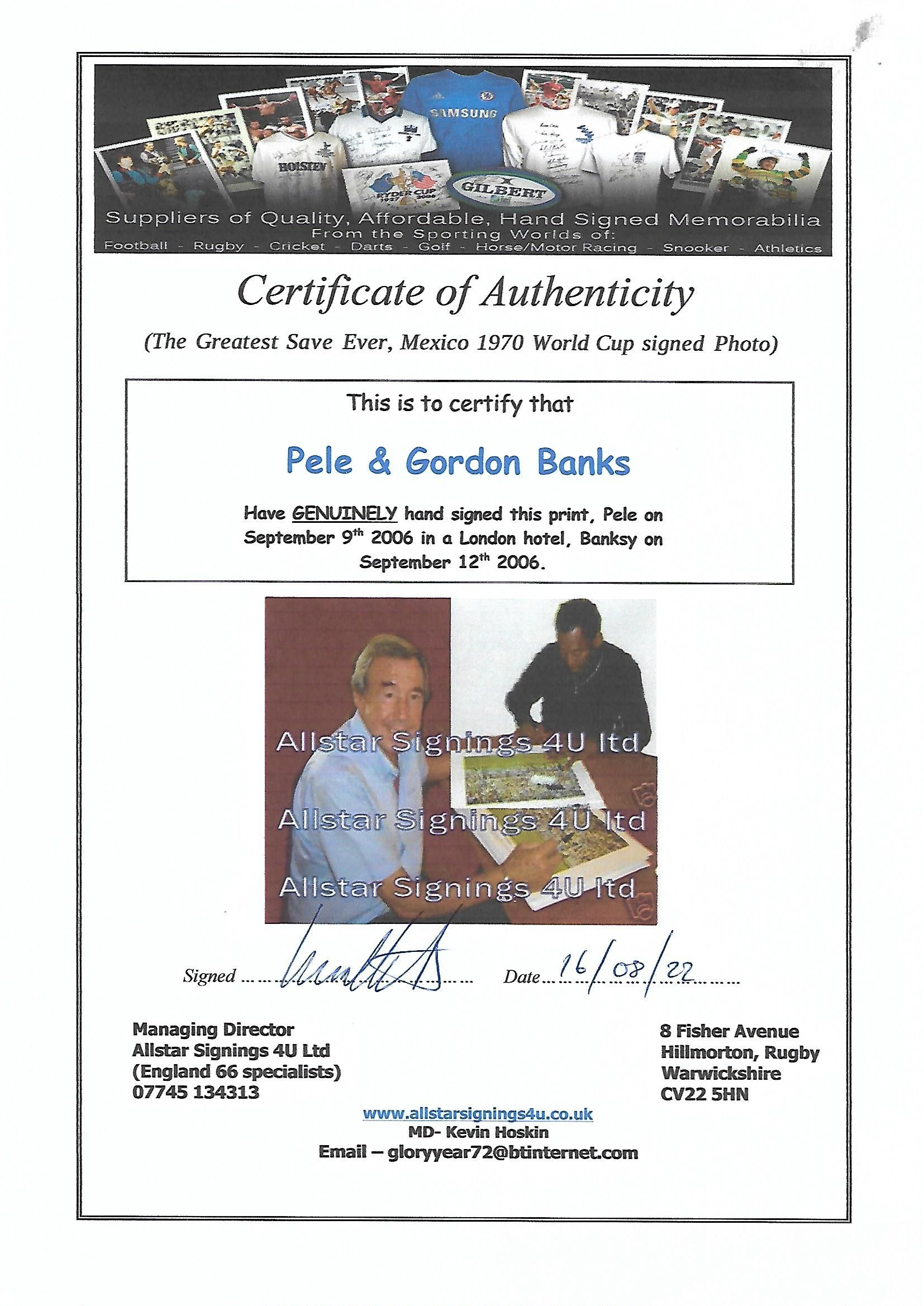 Pele and Gordon Banks “The Greatest Save Ever” hand signed, by both in black sharpie to lower border during two separate private signings, mounted, glazed and framed to measure 21 X 17in., coming complete with COA and photograph proof of both signing