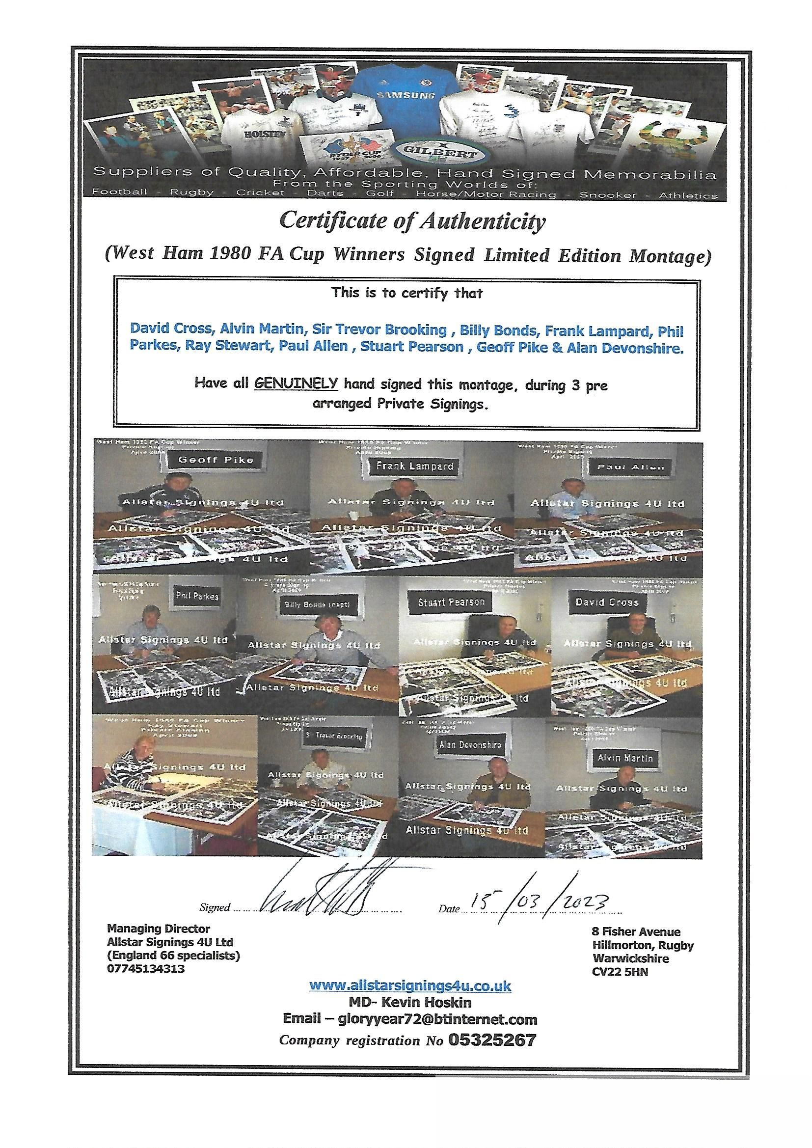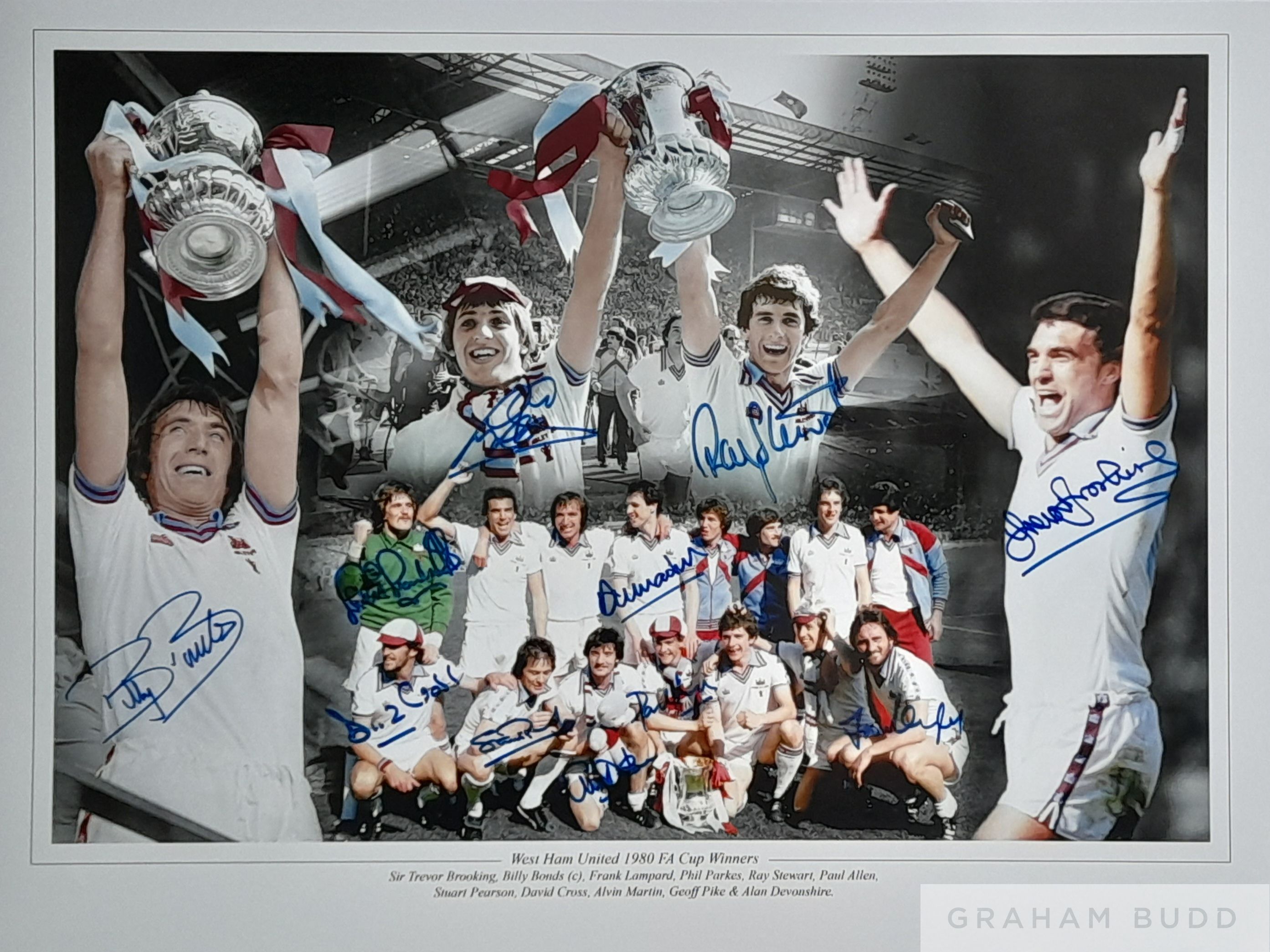 West Ham United 1980 FA Cup Winners signed montage made up of high resolution images from the final, signed by the 11 man winning team that beat Arsenal 1-0 thanks to a rare diving headed goal from Trevor Brooking. The 11 autographs are, David Cross, Alvin Martin, Sir Trevor Brooking, Billy Bonds (captain), Frank Lampard, Phil Parkes, Ray Stewart, Paul Allen, Stuart Pearson, Geoff Pike & Alan Devonshire. Comes with COA and photograph proof of players signing