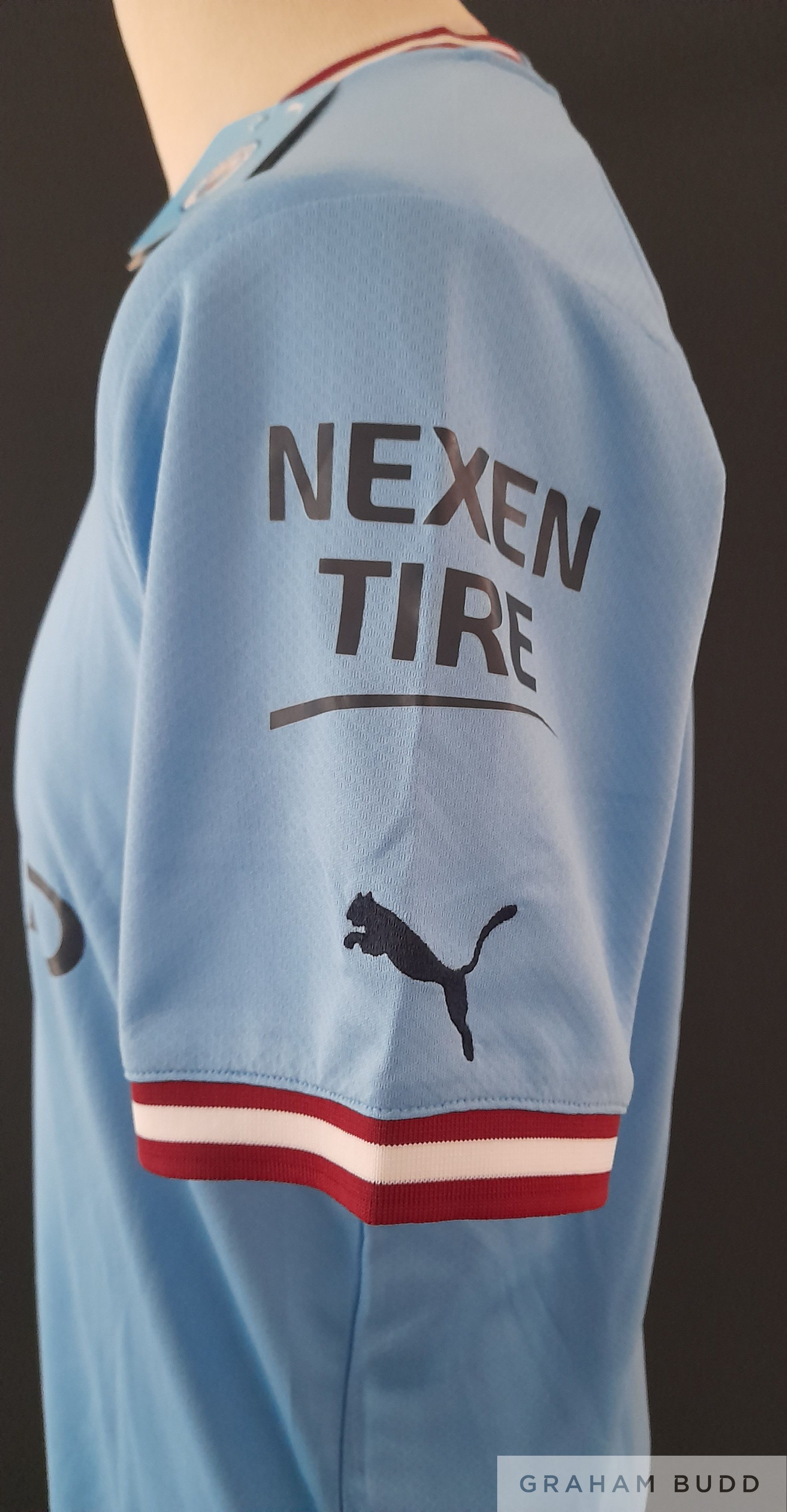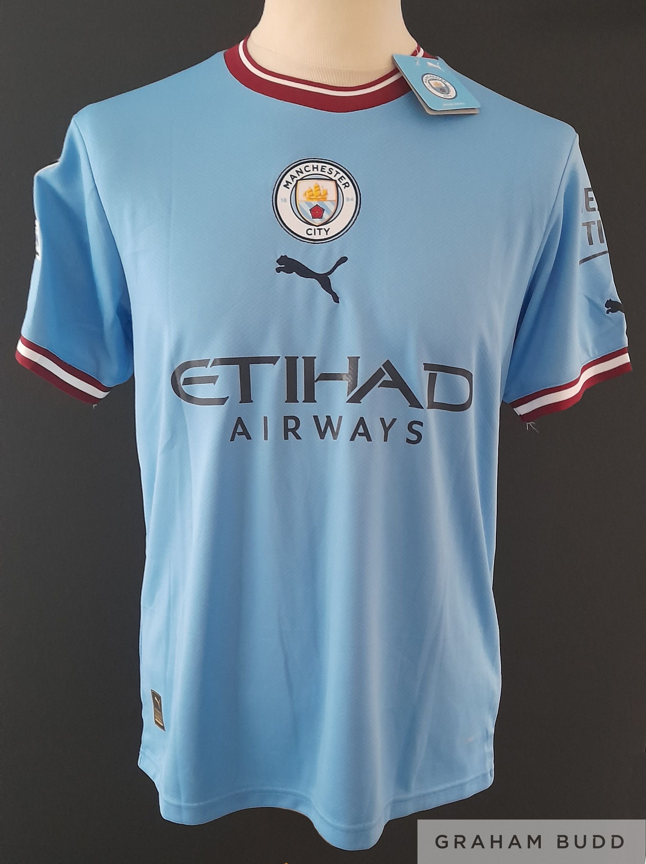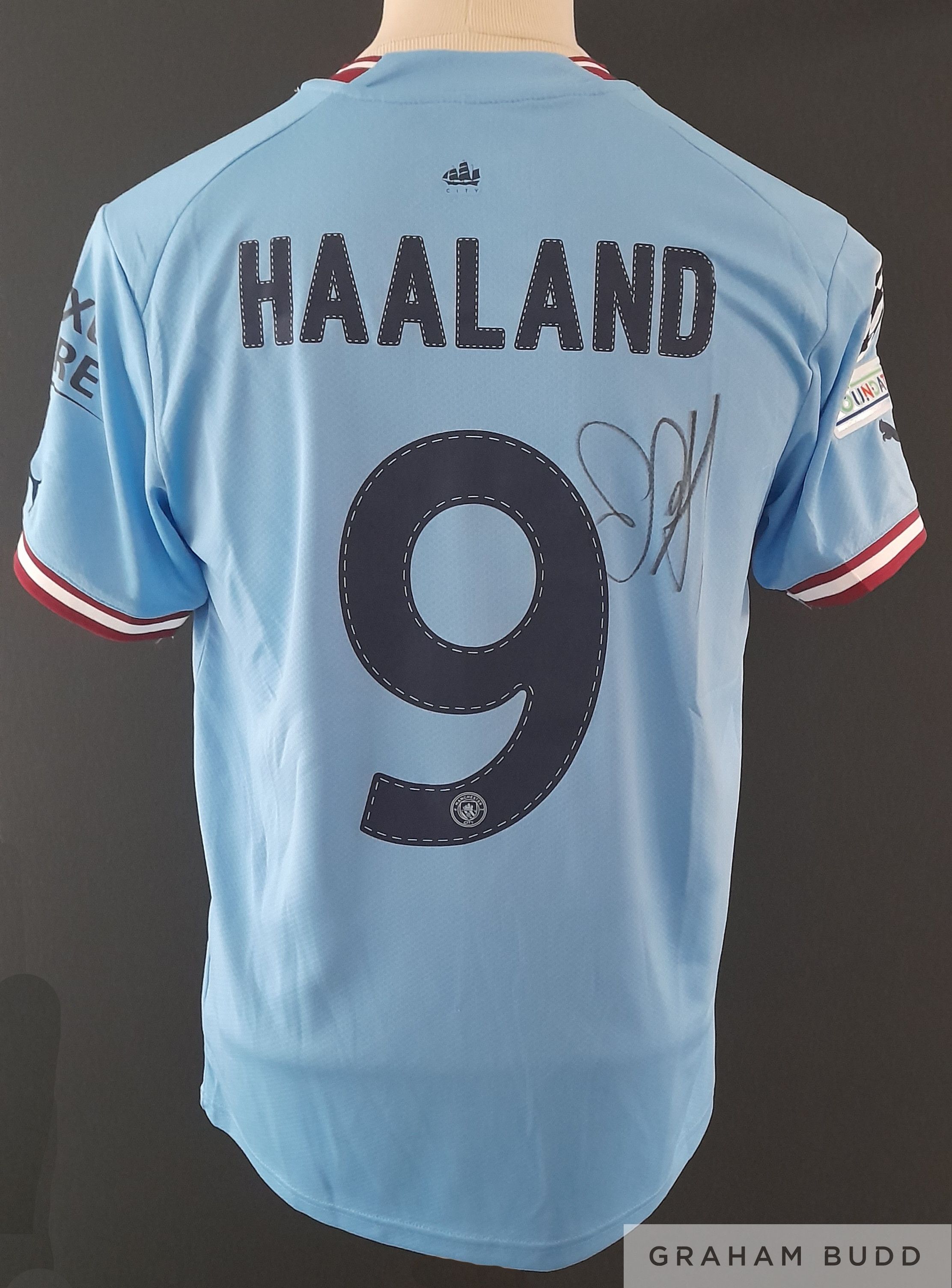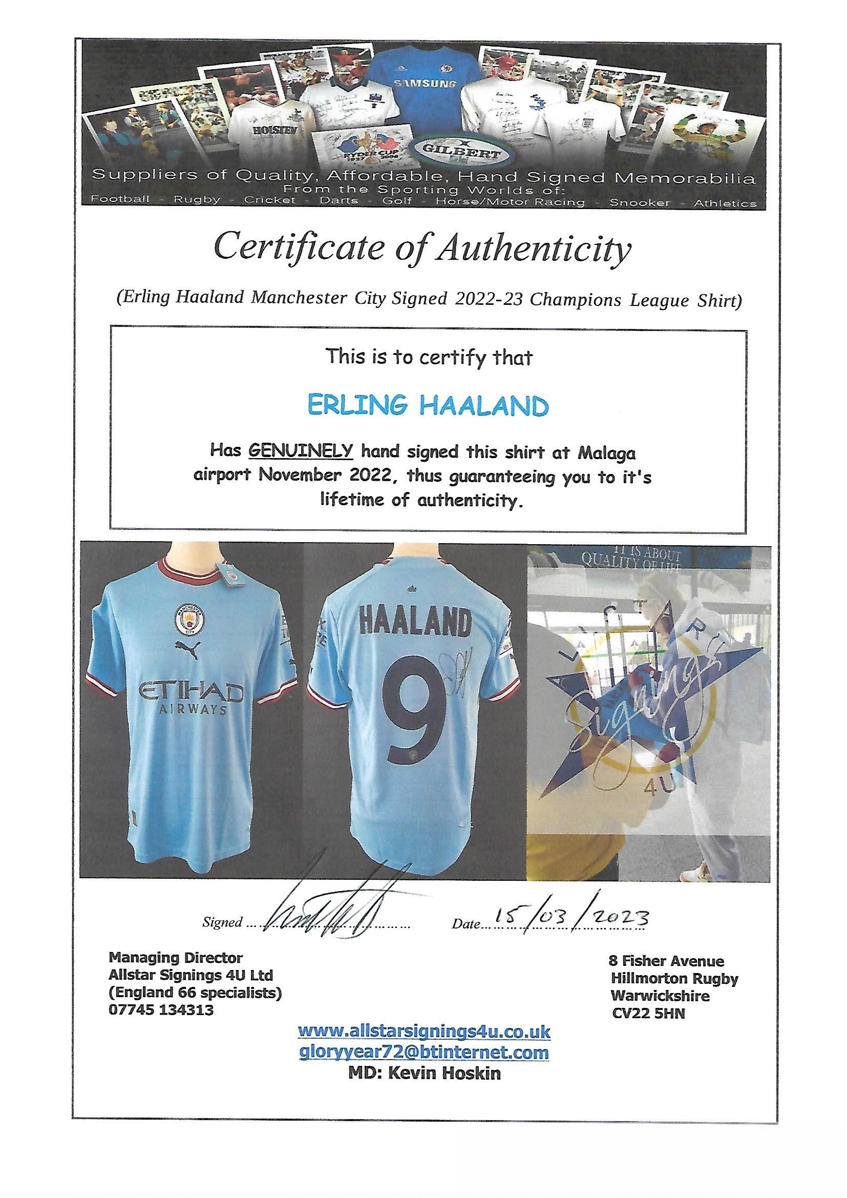 Erling Haaland signed Manchester City 2022-23 Champions League shirt, which is brand new with tags still attached. Haaland signed whilst coming out of Malaga airport November 2022 whilst out warm weather training. Comes complete with COA and incorporating photograph of Erling signing