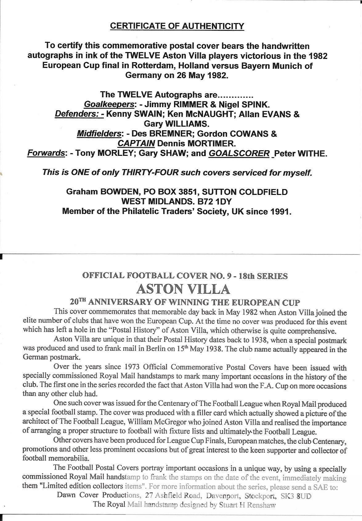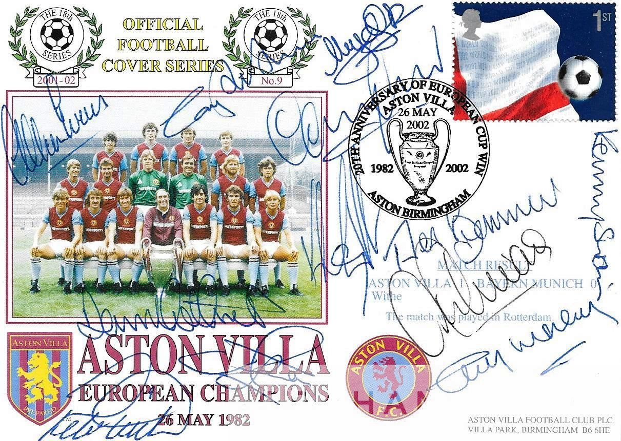 Aston Villa 1982 European Cup winners postal cover issued to mark the 20th Anniversary of Villa's and hand signed by 12 of the winning team, Jimmy Rimmer, Nigel Spink, Kenny Swain, Ken McNaught, Allan Evans, Gary Williams, Des Bremner, Gordon Cowans, Dennis Mortimer (c), Tony Morley, Gary Shaw and goal scorer Peter Withe, with COA, in mint condition
