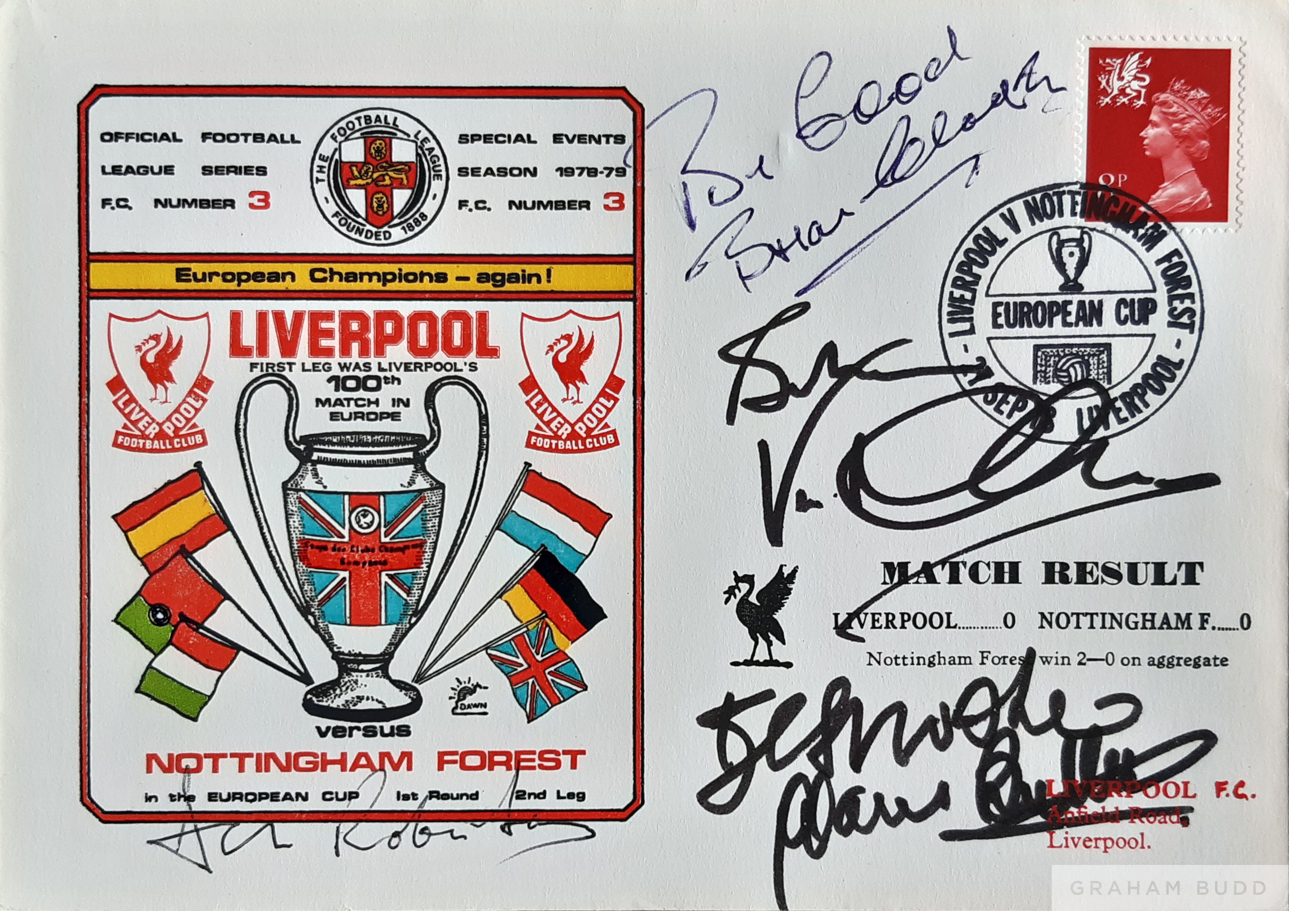 Nottingham Forest autographs, Official Football League Series Special Events First Day Cover. FC No 3 Season 1978-79 Liverpool v Nottingham Forest, 1st leg European Cup ending 0-0, signed by manager Brian Clough, Viv Anderson, Gary Birtles and John Robertson, complete with statistical insert card