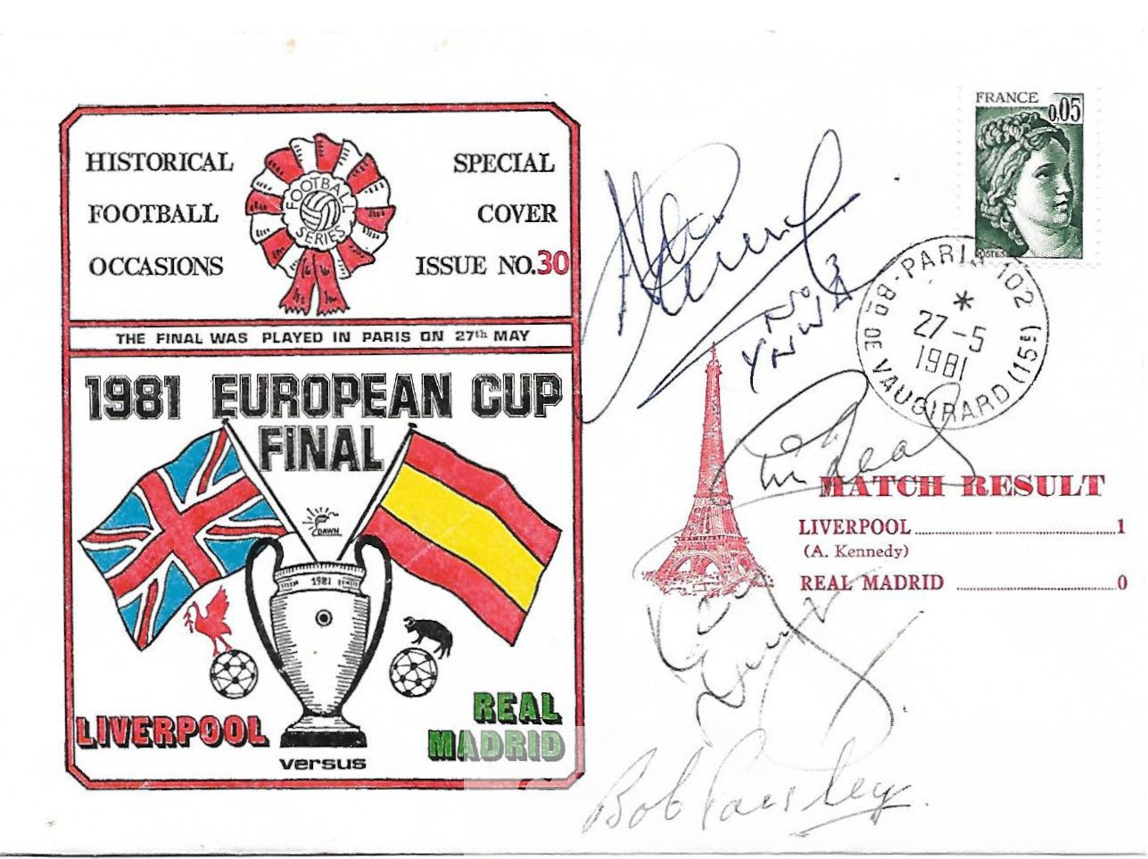 Liverpool signed Official Football Series First Day Cover Number 30 celebrating Liverpool's 1981 European Cup Final victory over Bruges 1-0 in Paris, features the autographs of manager Bob Paisley, Phil Neal, Kenny Dalglish and winning goal scorer Alan Kennedy. Cover is in excellent condition complete with detailed insert card