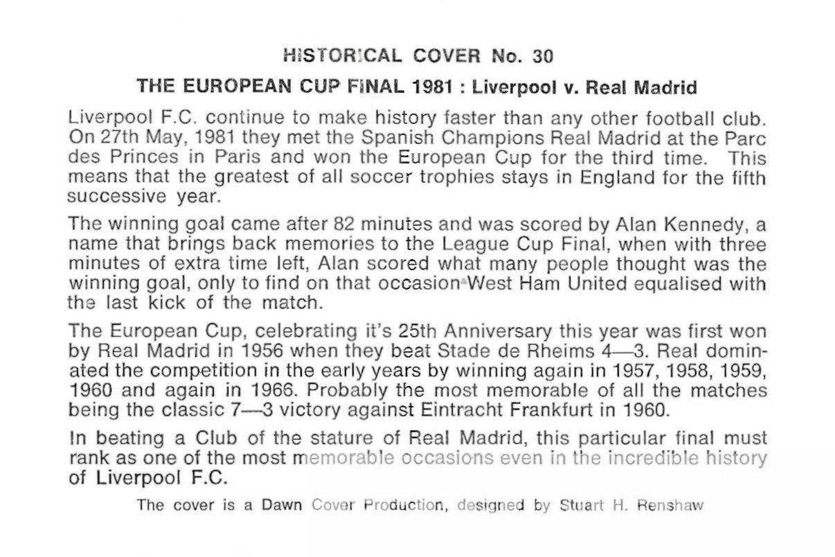 Liverpool signed Official Football Series First Day Cover Number 30 celebrating Liverpool's 1981 European Cup Final victory over Bruges 1-0 in Paris,