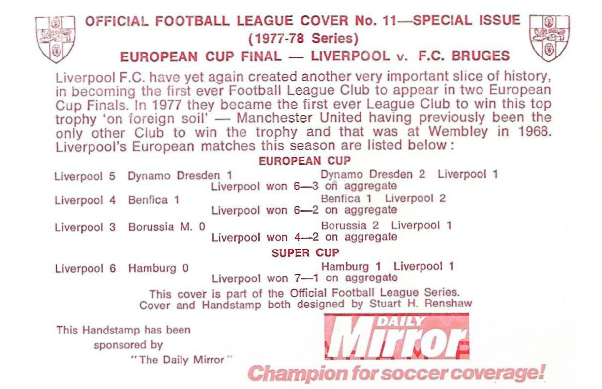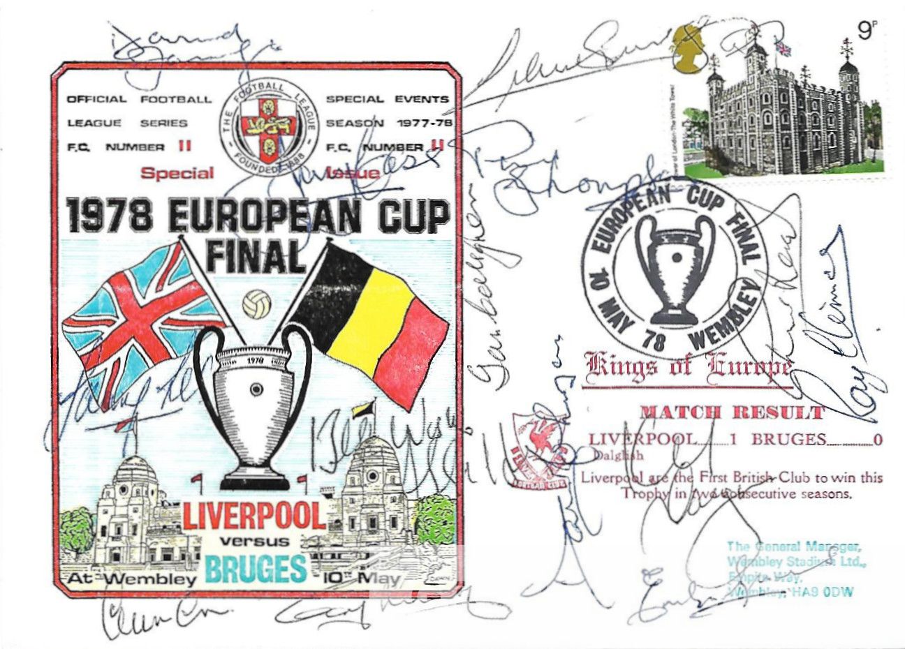 Liverpool signed by 14 Official Dawn Football Series No 11 First Day Cover celebrating Liverpool's 1978 European Cup Final victory over Real Madrid 1-0 at Wembley, features the autographs of David Fairclough, Graeme Souness, Jimmy Case, Phil Thompson, Ian Callaghan, David Johnson, Kenny Dalglish (winning goal scorer), Emlyn Hughes (c), Phil Neal, Ray Clemence, Alan Hansen, Sammy Lee, Colin Irwin and Ray Kennedy. Cover is in excellent condition complete with detailed insert card