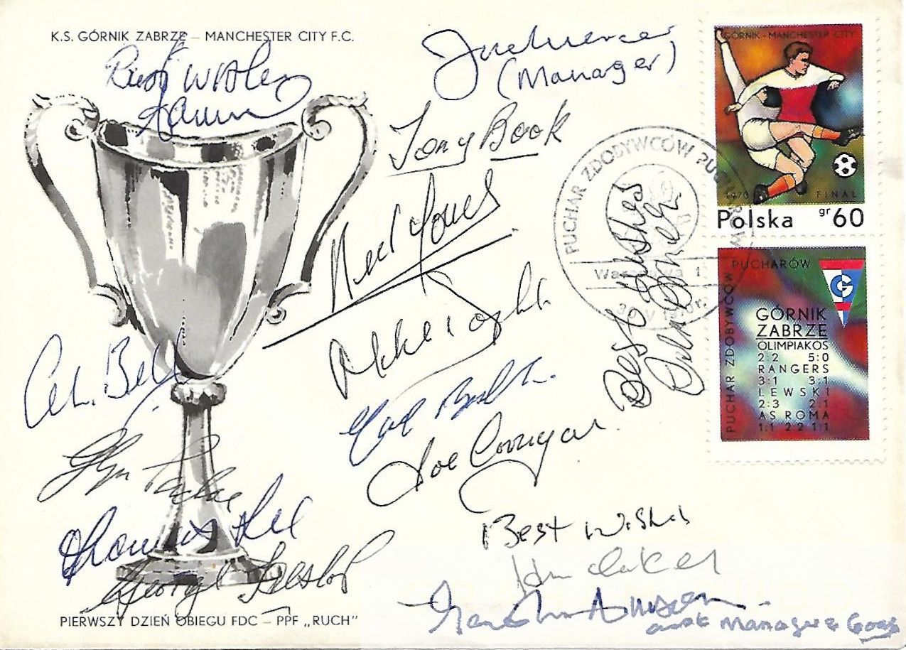 Manchester City 1969-70 European Cup Winners Cup Final team signed Polish FDC featuring 14 autographs of the City squad, also comes with four spare unfranked stamps. Man City beat Gornik Zabrze 2-1 on 29th April 1970 at the Praterstadion in Vinna Austria. The 14 signatures are Tony Towers, Tony Book, Neil Young, Mike Doyle, Colin Bell, Glynn Pardoe, Francis Lee, George Heslop, Alan Oakes, Joe Corrigan, Bobby Owen, Tommy Booth, Joe Mercer (manager) and Malcolm Allison (asst. manager & coach)