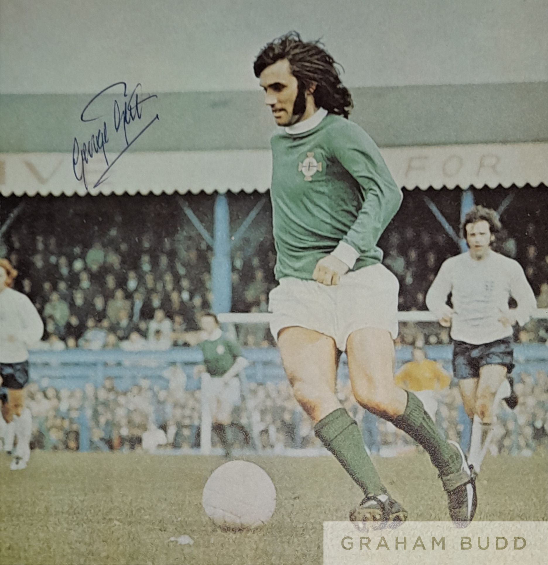 George Best Northern Ireland autographed colour picture removed from an old book, signed by George in blue biro it shows Best in action against England during a home nations championship match, measuring 21 x 20cm,