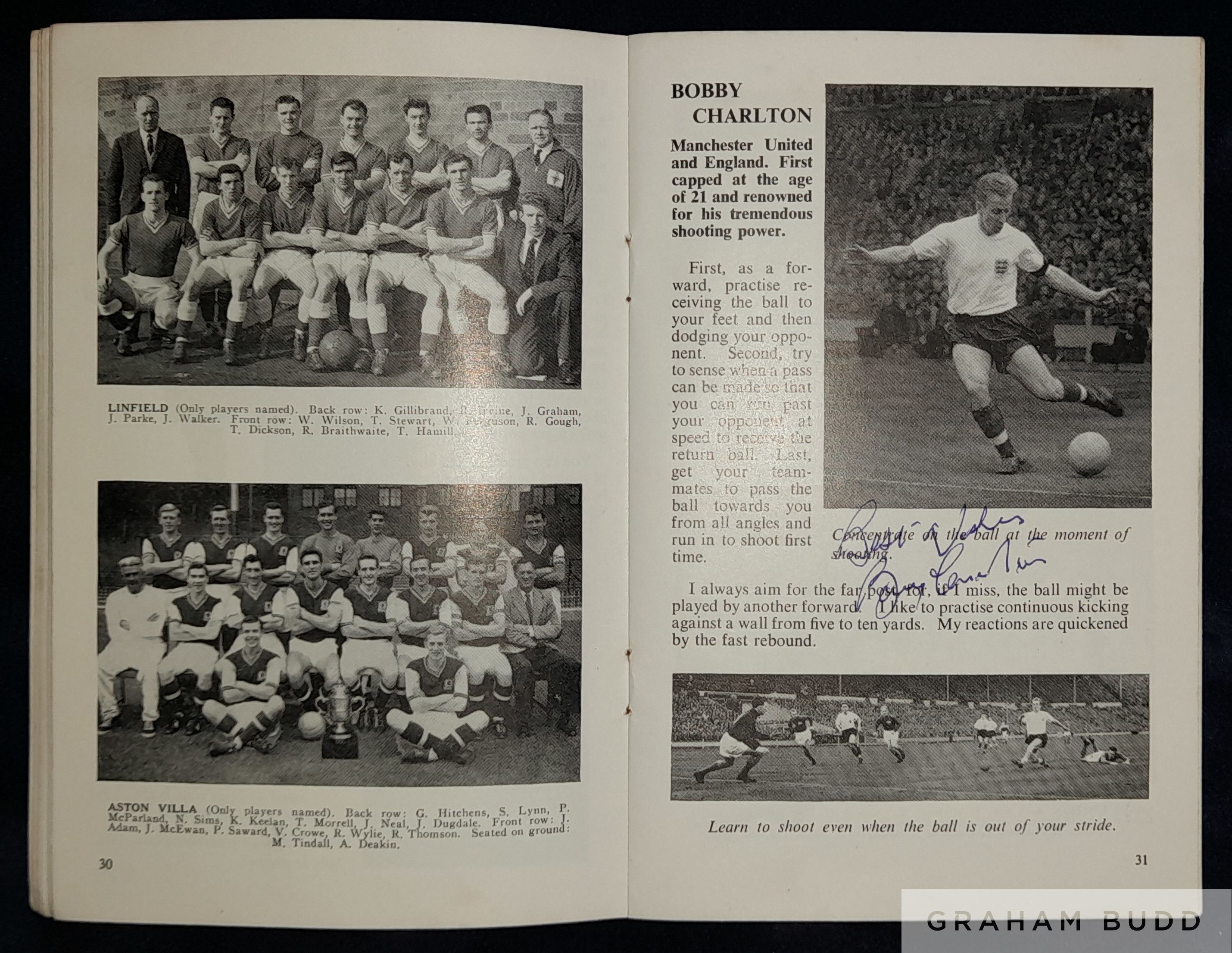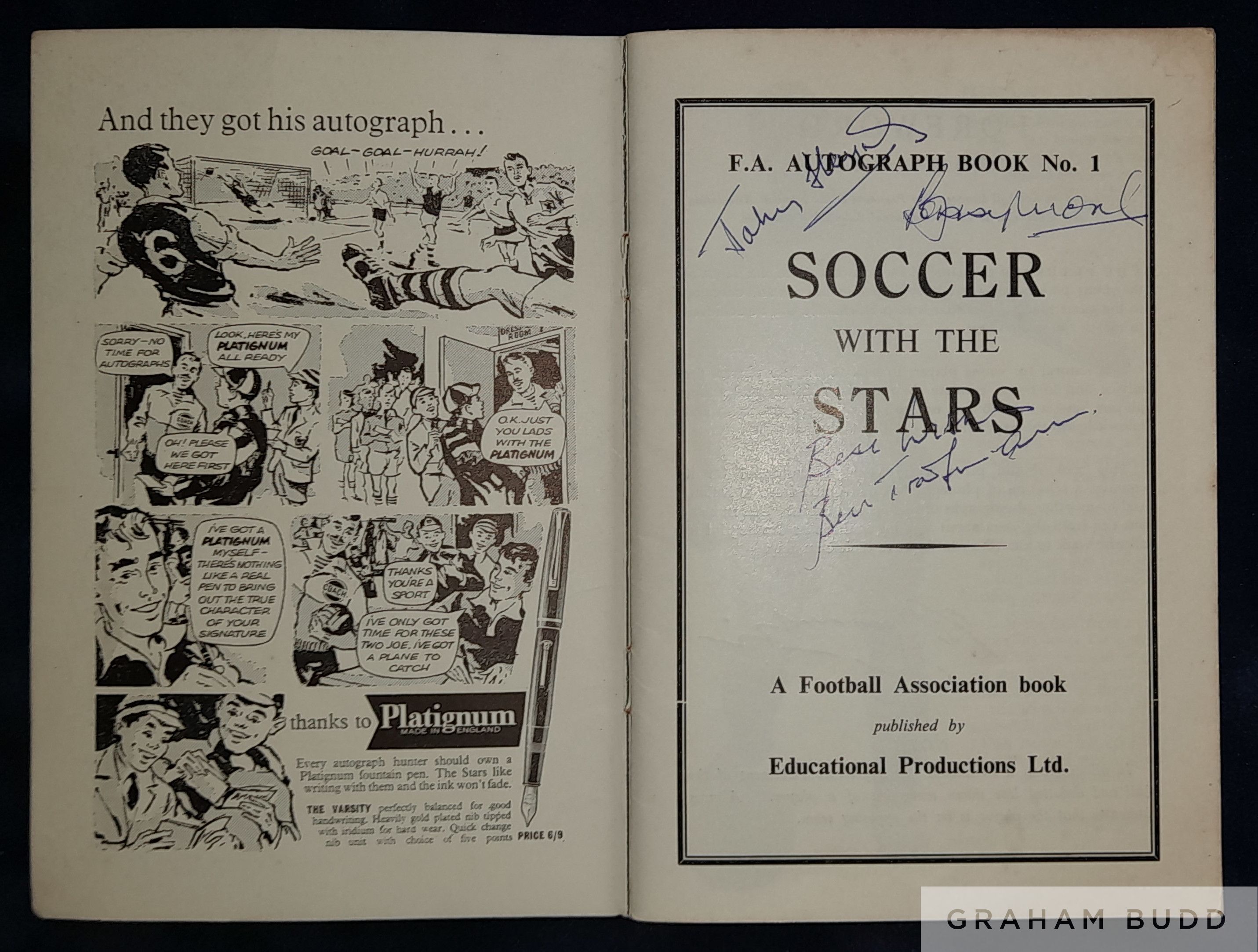 Soccer with the Stars F.A. Autograph Book No.1 signed by five legends of the game, Johnny Haynes, Bobby Moore, Bert Trautman, Jimmy Greaves and Bobb