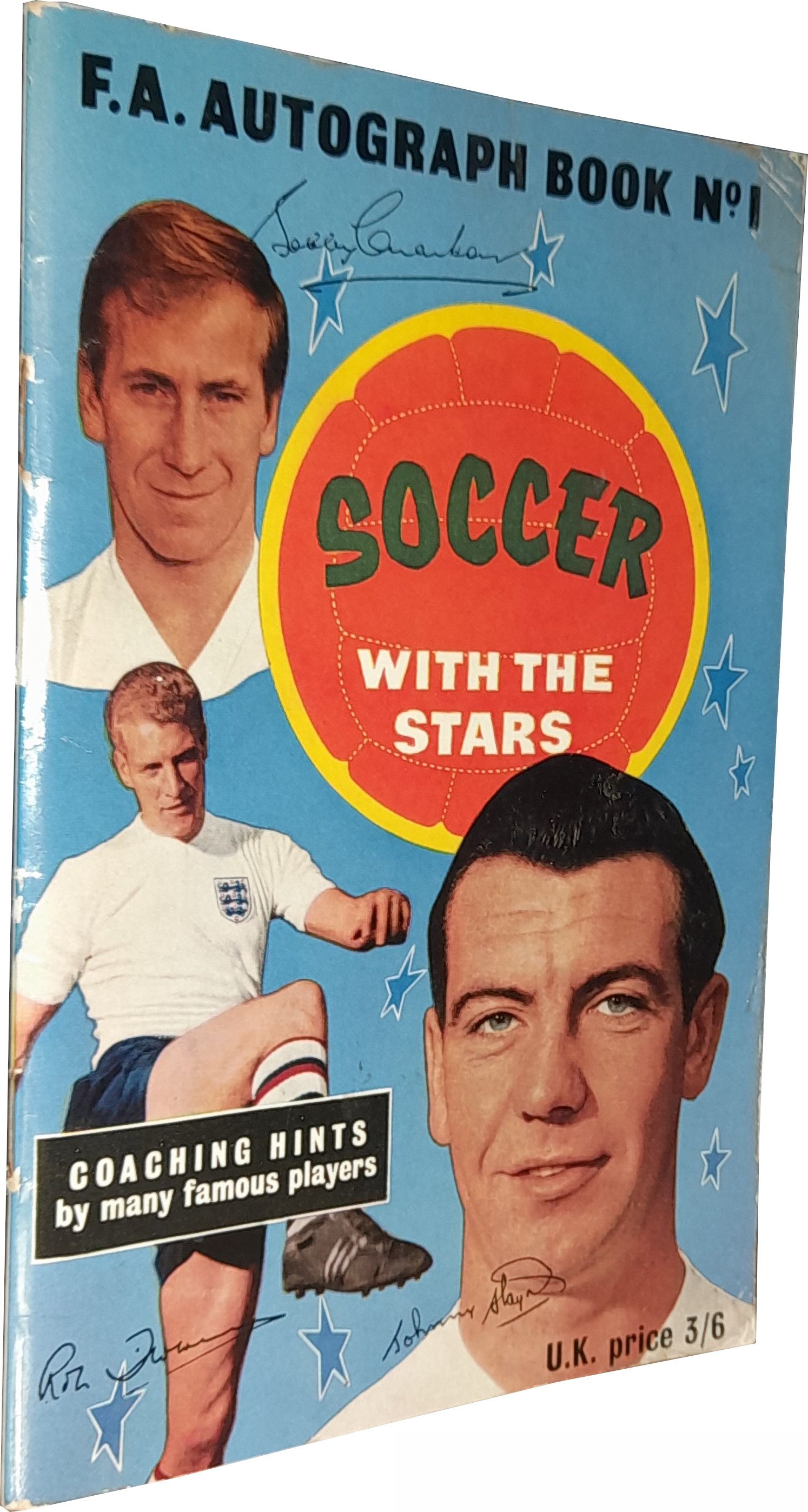 Soccer with the Stars F.A. Autograph Book No.1 signed by five legends of the game, Johnny Haynes, Bobby Moore, Bert Trautman, Jimmy Greaves and Bobby Charlton