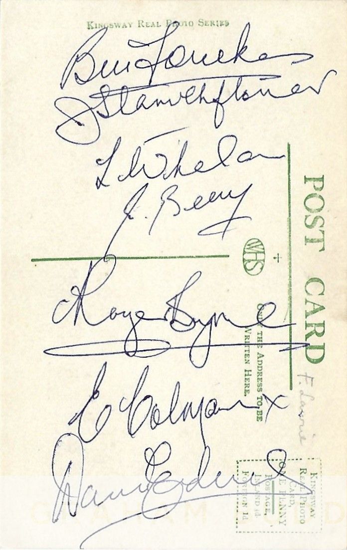 Manchester United Busby Babes signed 6 x 4in. postcard, featuring the autographs of Bill Foulkes, Jackie Blanchflower, Billy (Liam) Whelan, Johnny Berry, Roger Byrne, Eddie Colman and Duncan Edwards