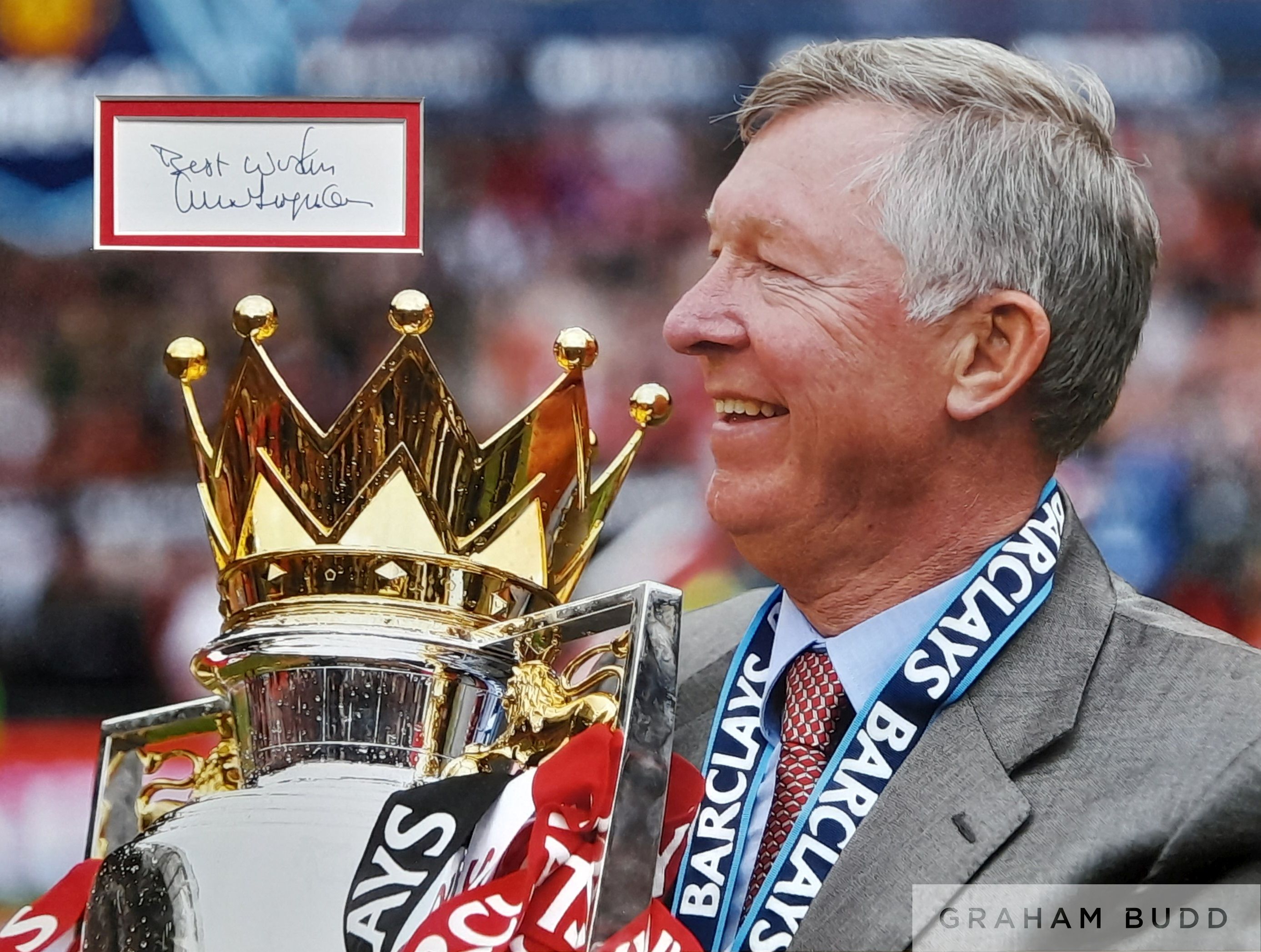 Sir Alex Ferguson ex Manchester United manager, their most successful of all time, signed card mounted within a photograph that's been mounted, and measures 20 x 16in. which is a standard frame size. Shown here holding the 2011 Barclays Premier League trophy. Signature cropped from book which is included with auction lot