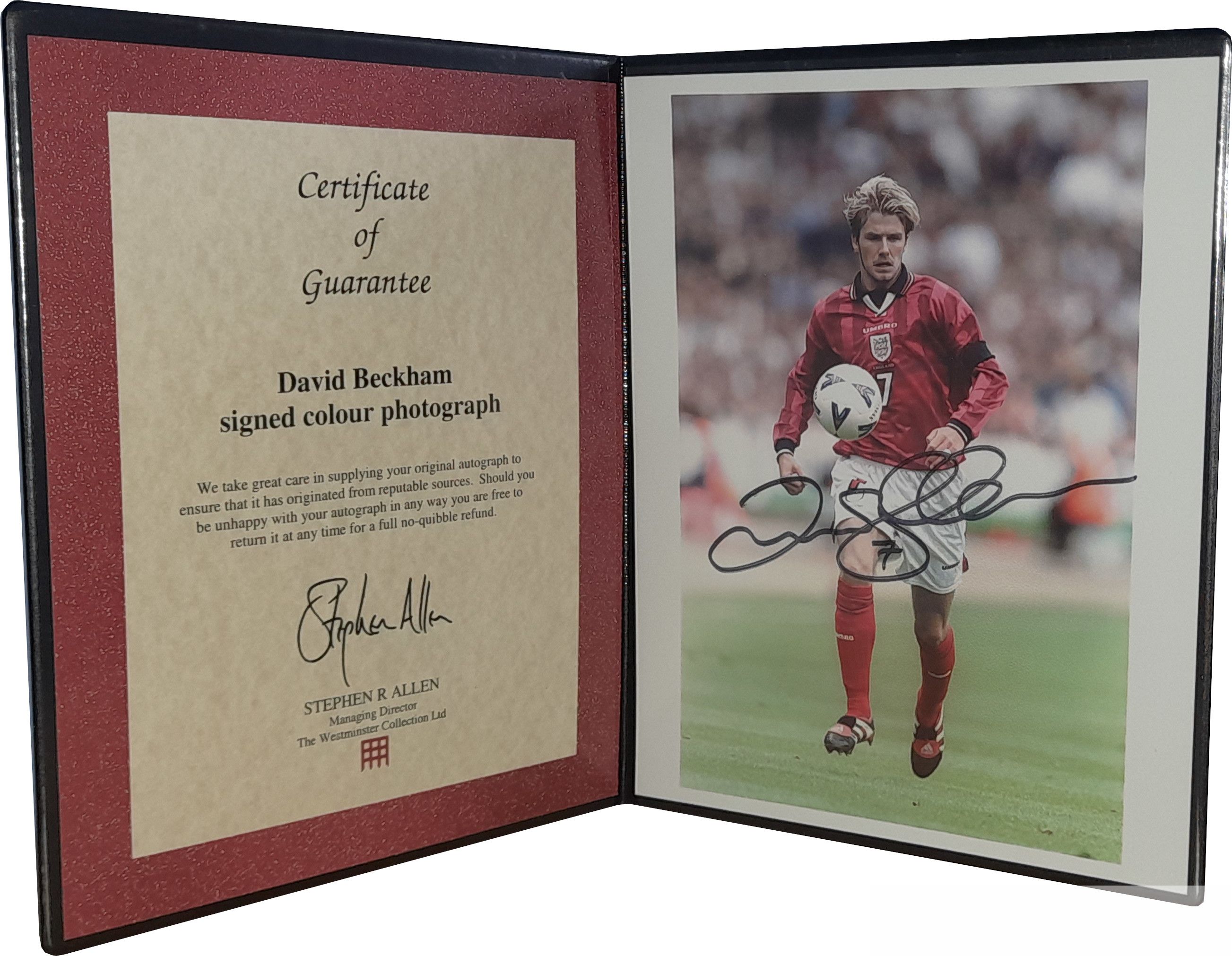 David Beckham official signed England photograph in leather bound slip case, complete with certificate of authenticity certified by Westminster Collection Ltd Managing Director, Stephen R Allen. Photograph measures 10 x 8in. including white borders