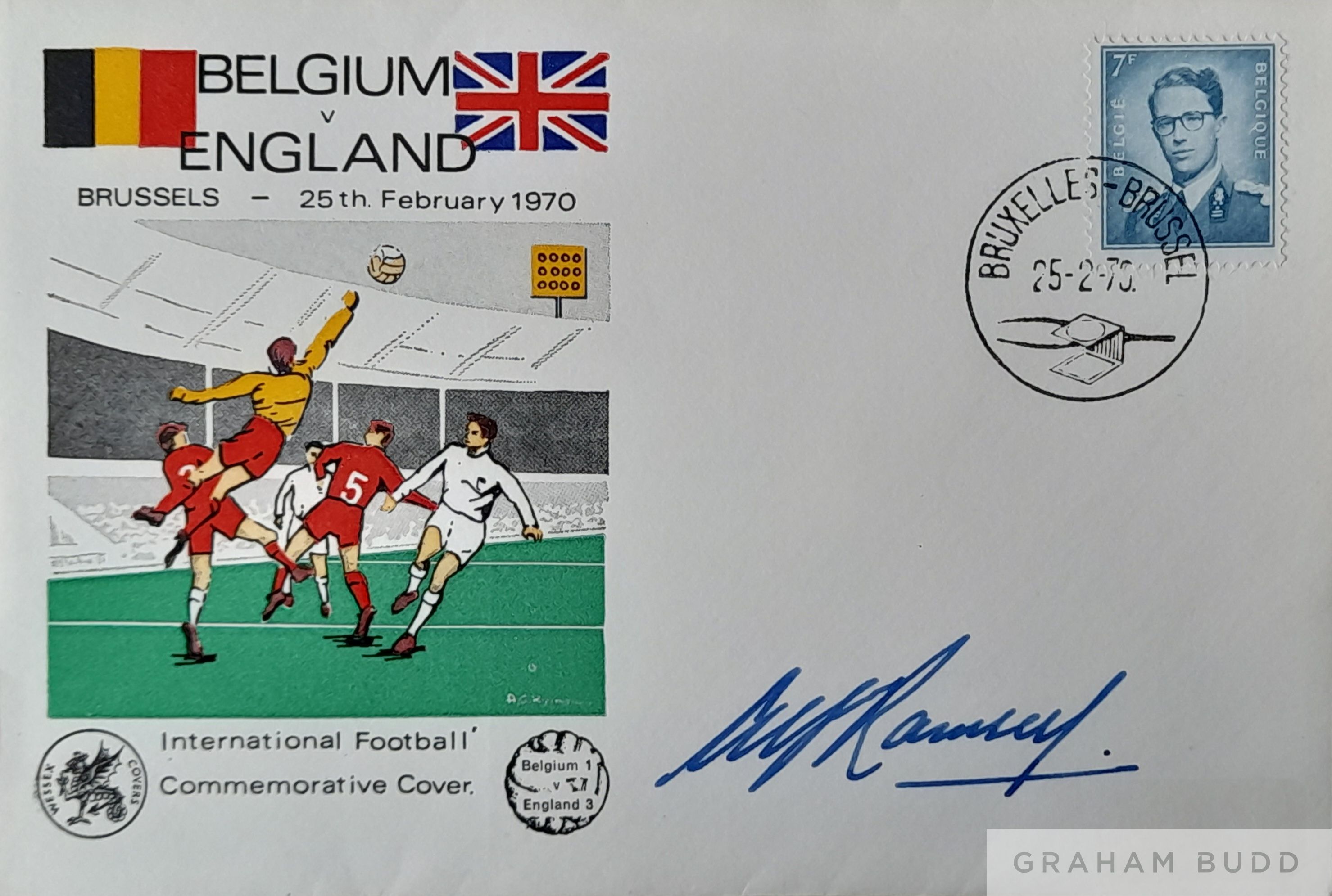 Sir Alf Ramsey ex England manager signed FDC, 1970 Belgium v England International Football Commemorative Postal Cover with Match Result, with stamp, franked Bruxelles - Brussel 25-2-70
