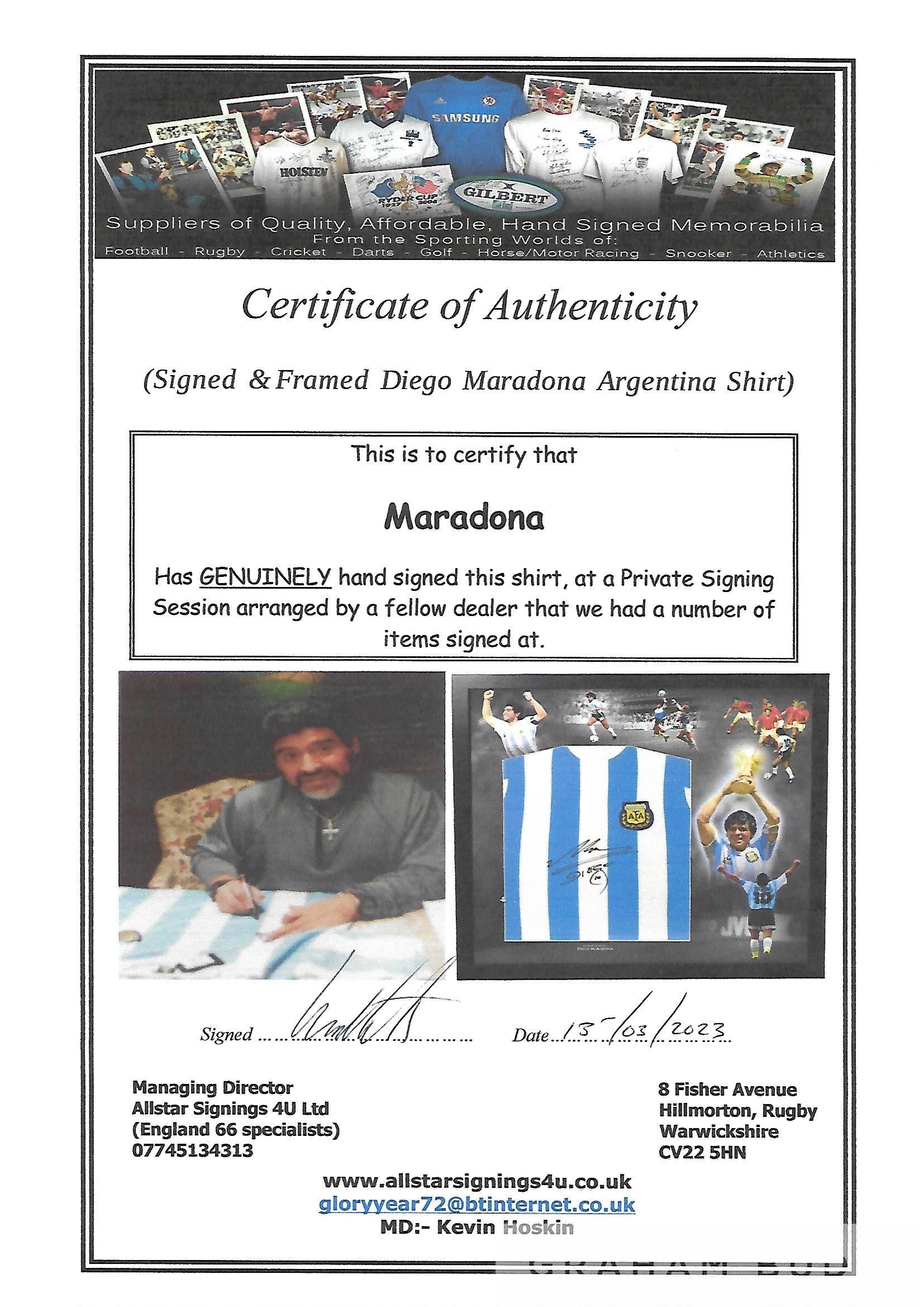 Diego Maradona signed and framed Argentina 1986 World Cup winners retro shirt, frame measures 33 x 33in., comes complete with COA and photograph pro