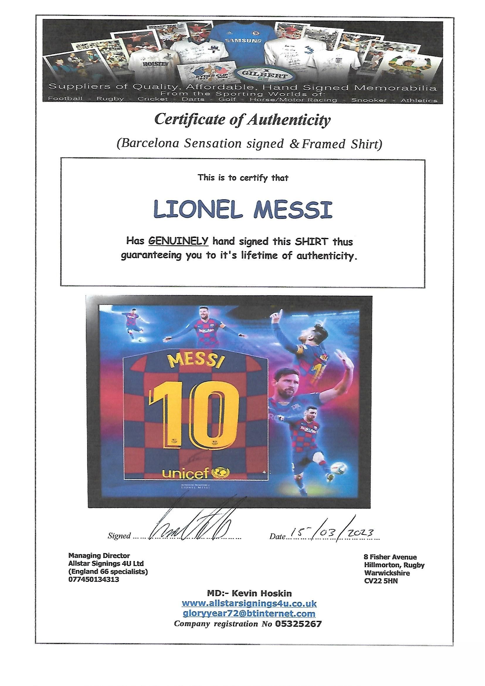 Lionel Messi signed and framed Barcelona 2019-20 home retro shirt, frame measures 33 x 33in. and comes complete with COA, please note "frontage of f