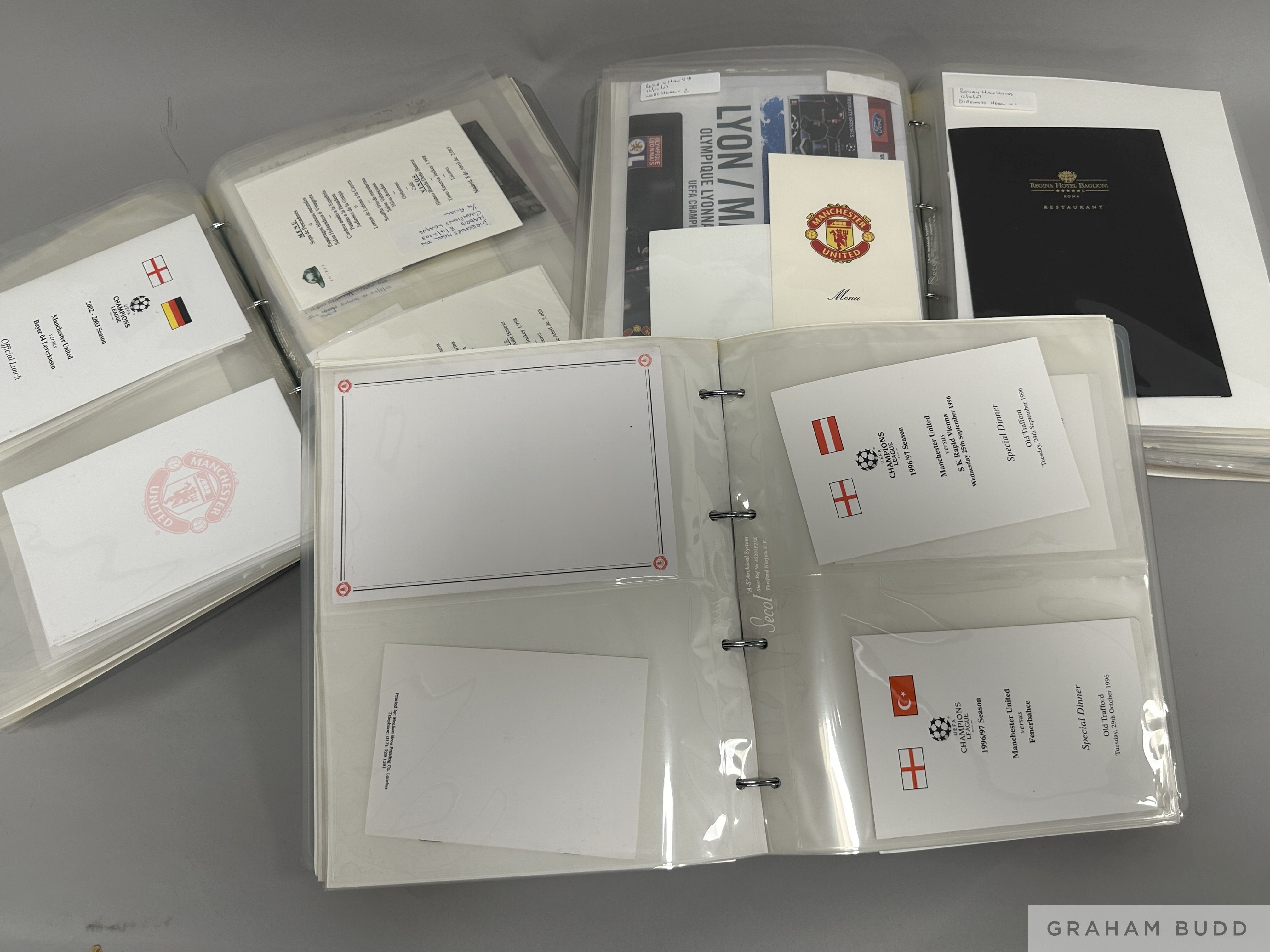 Three albums containing menus for dinners attended by Manchester United club officials dating between 1990 and 2010, one album pre-2000, two albums post 2000, special lunches and dinners at Old Trafford, many for Champions League and other European competition fixtures, also high profile domestic season occasions and England internationals at Old Trafford, also menus for similar European match occasions at opposition venues, the albums containing occasional other ephemera including match/press tickets, (3)