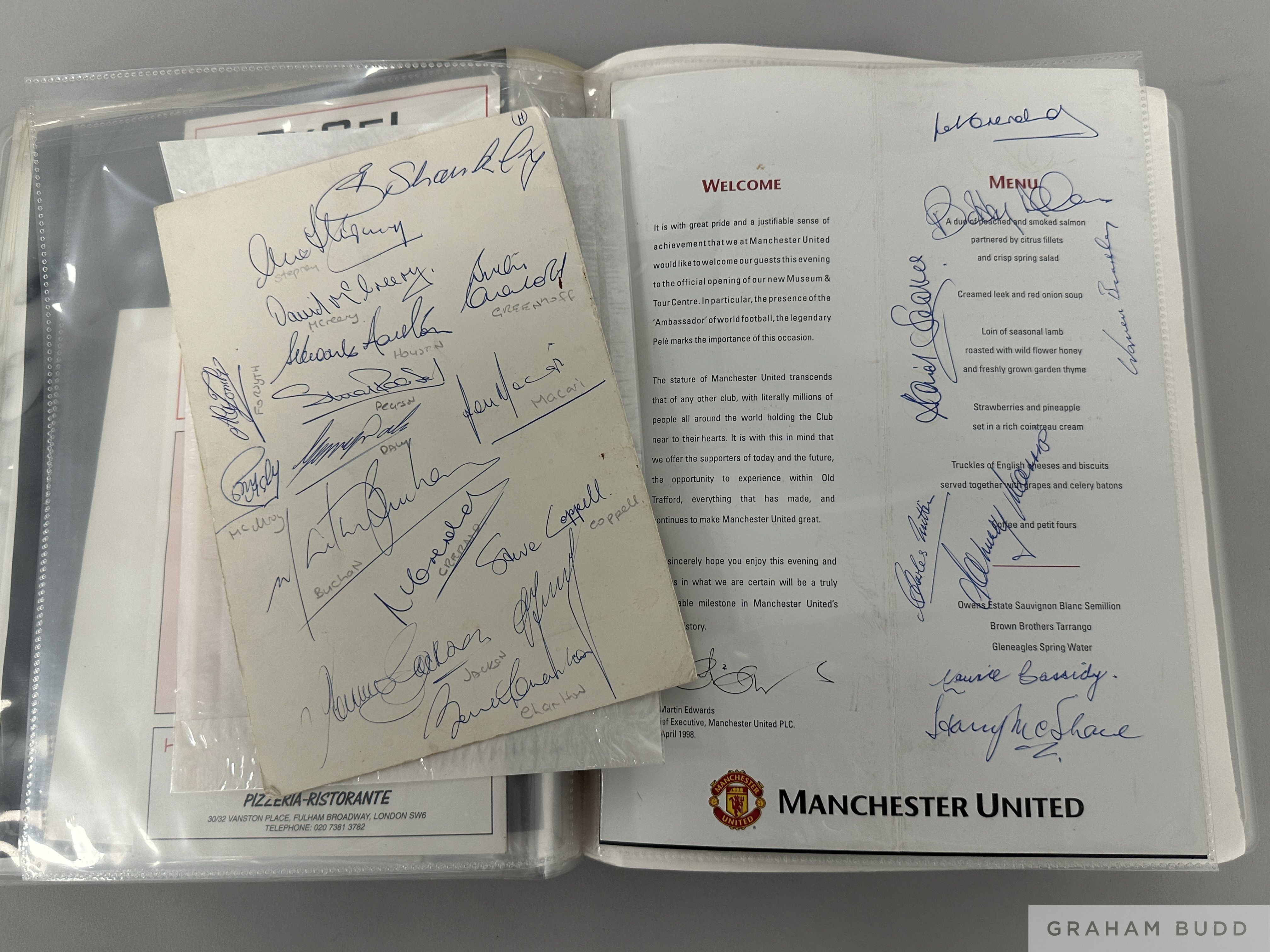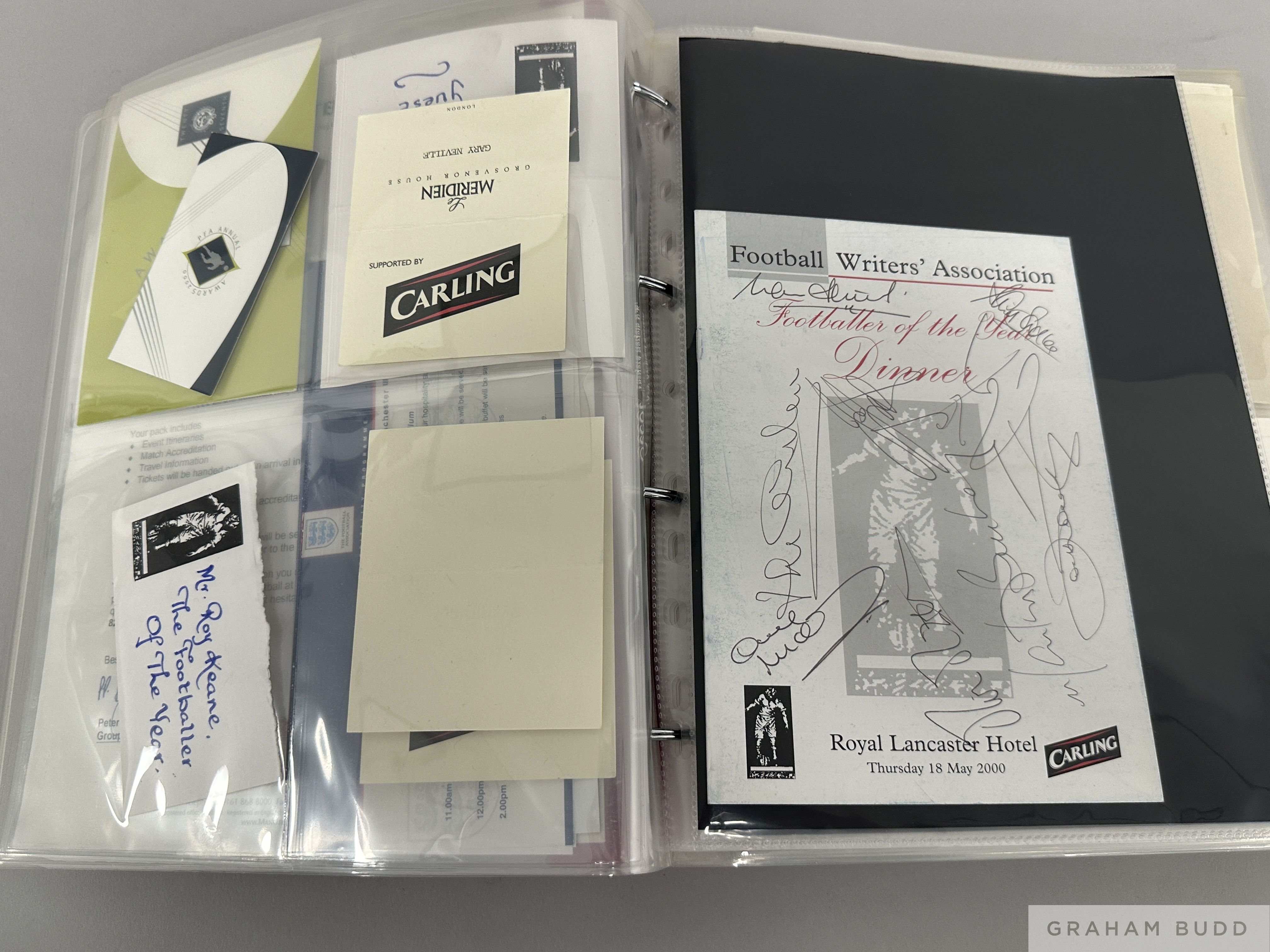 Collection of Manchester United dinner menus and associated memorabilia including autographed items, including 1963 F.A. Cup Final Manchester-Wembley train menu, 2000 & 2001 Charity Shield, 2000 FWA Footballer of the Year, FWA George Best Tribute Dinner 2000; F.A. Cup Finals 1983, 1994 & 1996, Omagh Bomb Disaster Fund, 1983 League Cup Final, Flight menu for the 2000 FIFA World Club Championship, Anglo-American Sporting Club menus 1975 to honour MUFC, and other miscellaneous items, many items bearing autographs to include Roy Keane, Mark Bosnich, Gary Neville, Maurice Setters, David Sadler, George Best, Bobby Charlton, Pat Crerand, Sammy McIlroy, Martin Buchan and many others, (qty)