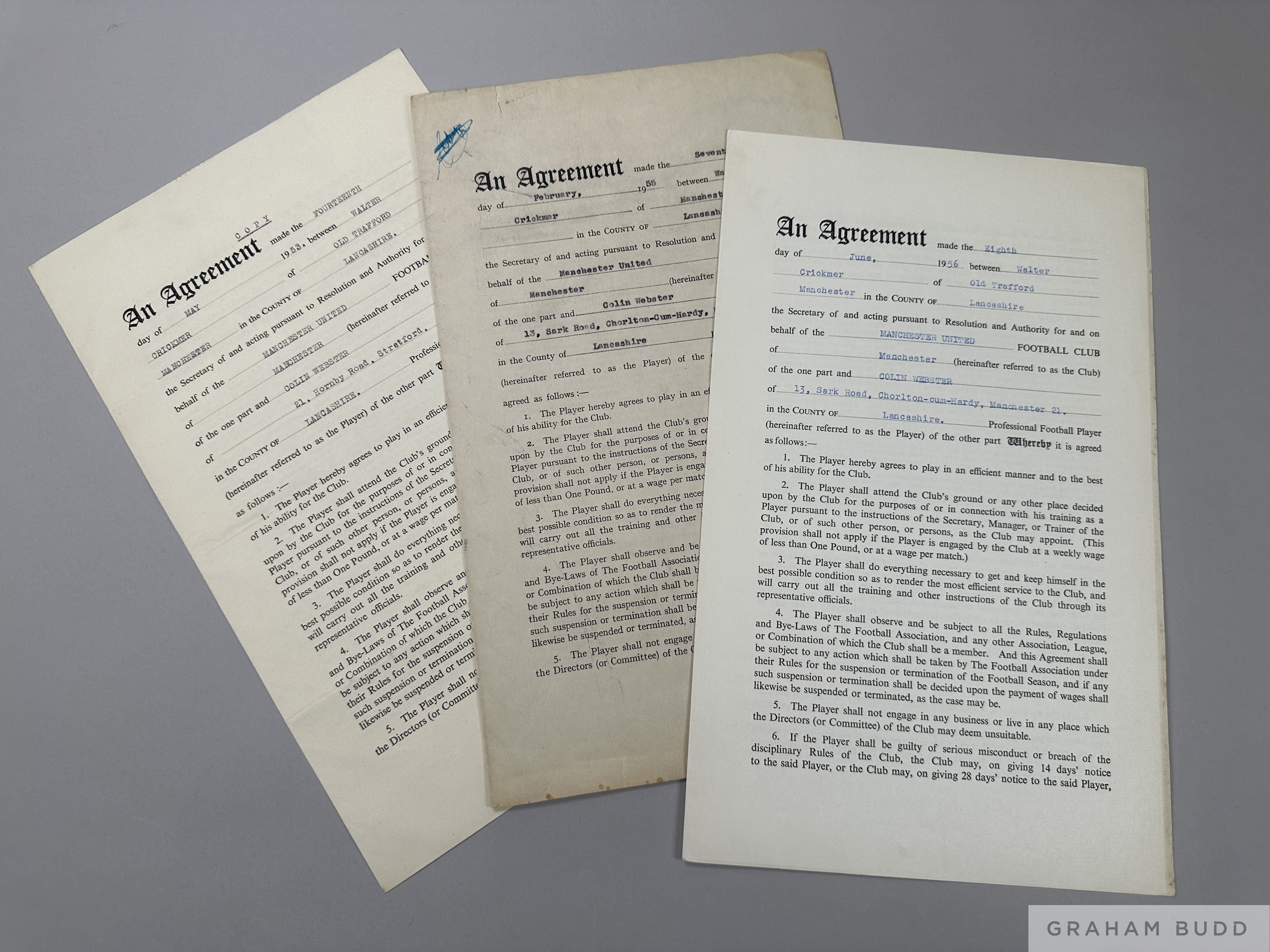 Three Manchester United Players Contracts for Colin Webster for seasons 1953-54, 1954-55 1956-57, drawn up on behalf of MUFC by the Club Secretary Walter Crickmer, agreements for the player to be paid £15 per week and £8/12 per week during the close season, one signed by player and secretary, another signed by the player only, the third unsigned, (3)
