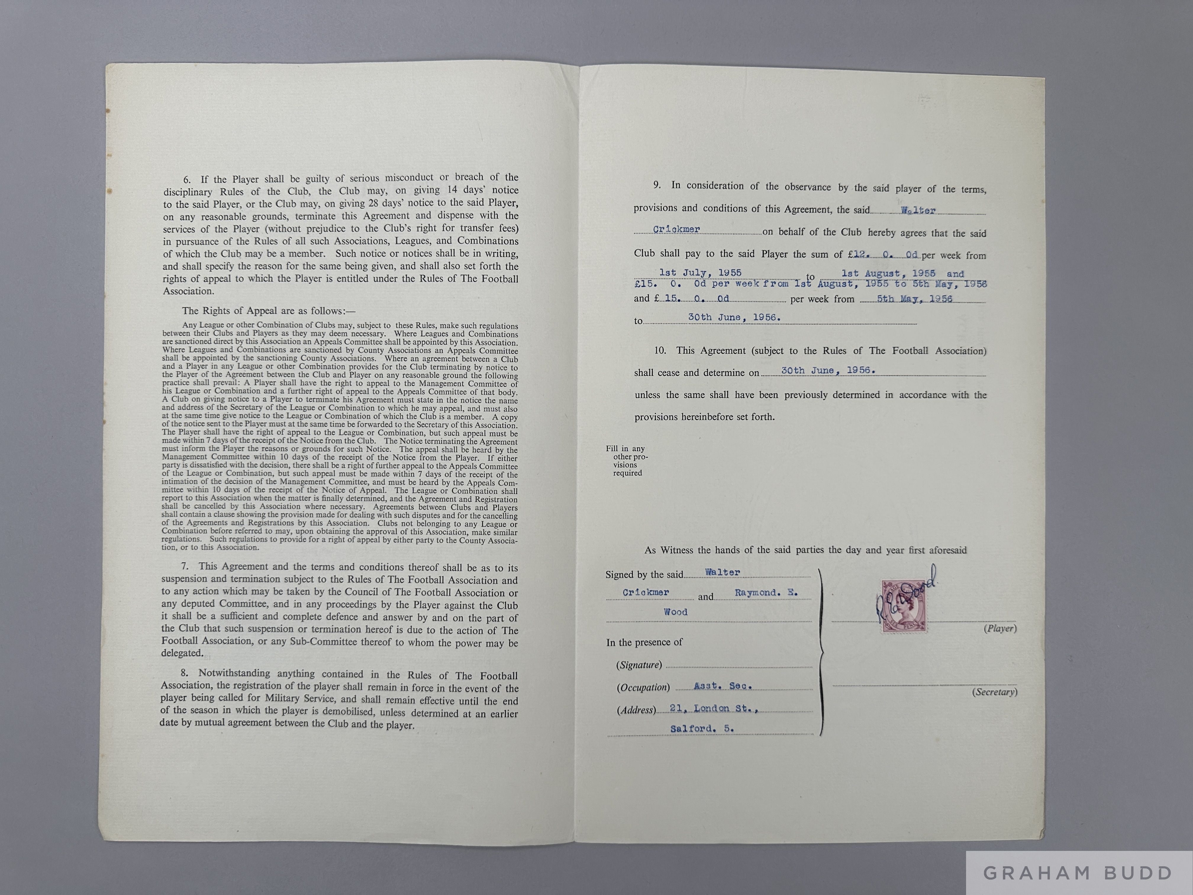 Manchester United Player's Contract for Ray Wood for season 1955-56, drawn up on behalf of MUFC by the Club Secretary Walter Crickmer, an agreement f