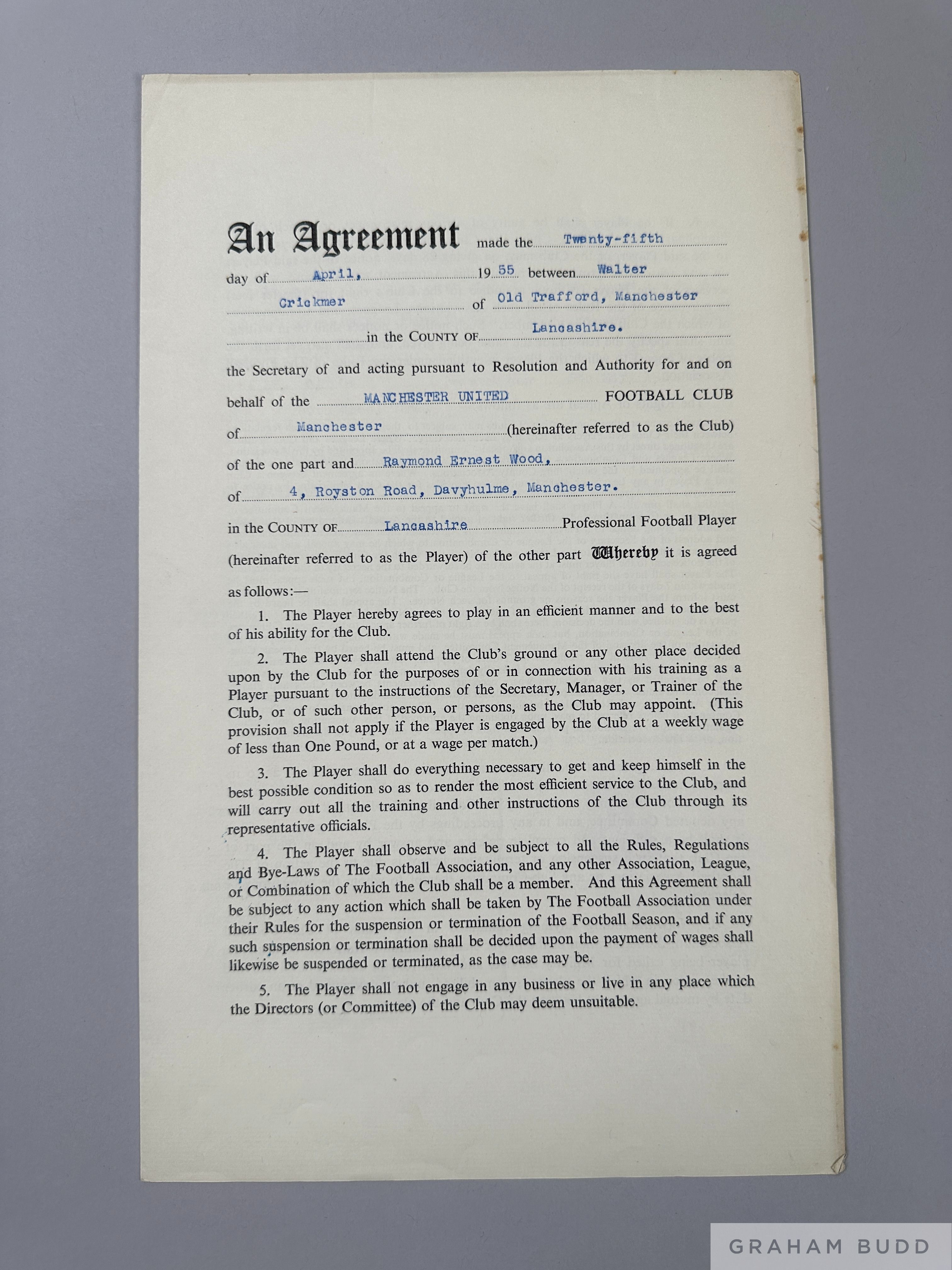 Manchester United Player's Contract for Ray Wood for season 1955-56, drawn up on behalf of MUFC by the Club Secretary Walter Crickmer, an agreement for the player to be paid £15 per week and the same during the close season, signed by the player only