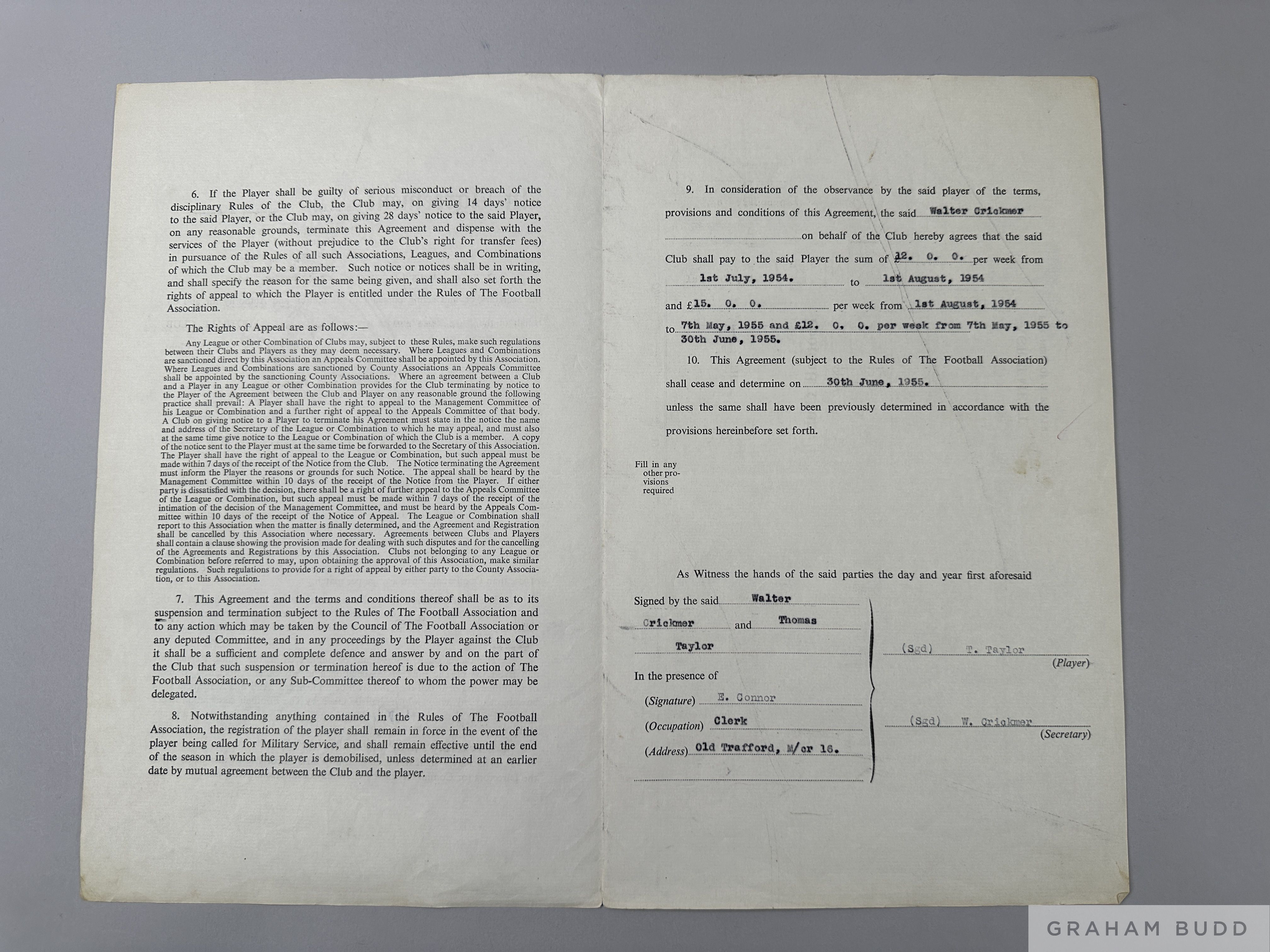 Manchester United Player's Contract for Tommy Taylor for season 1954-55, drawn up on behalf of MUFC by the Club Secretary Walter Crickmer, an agreement for the player to be paid £15 per week and £12 per week during the close season