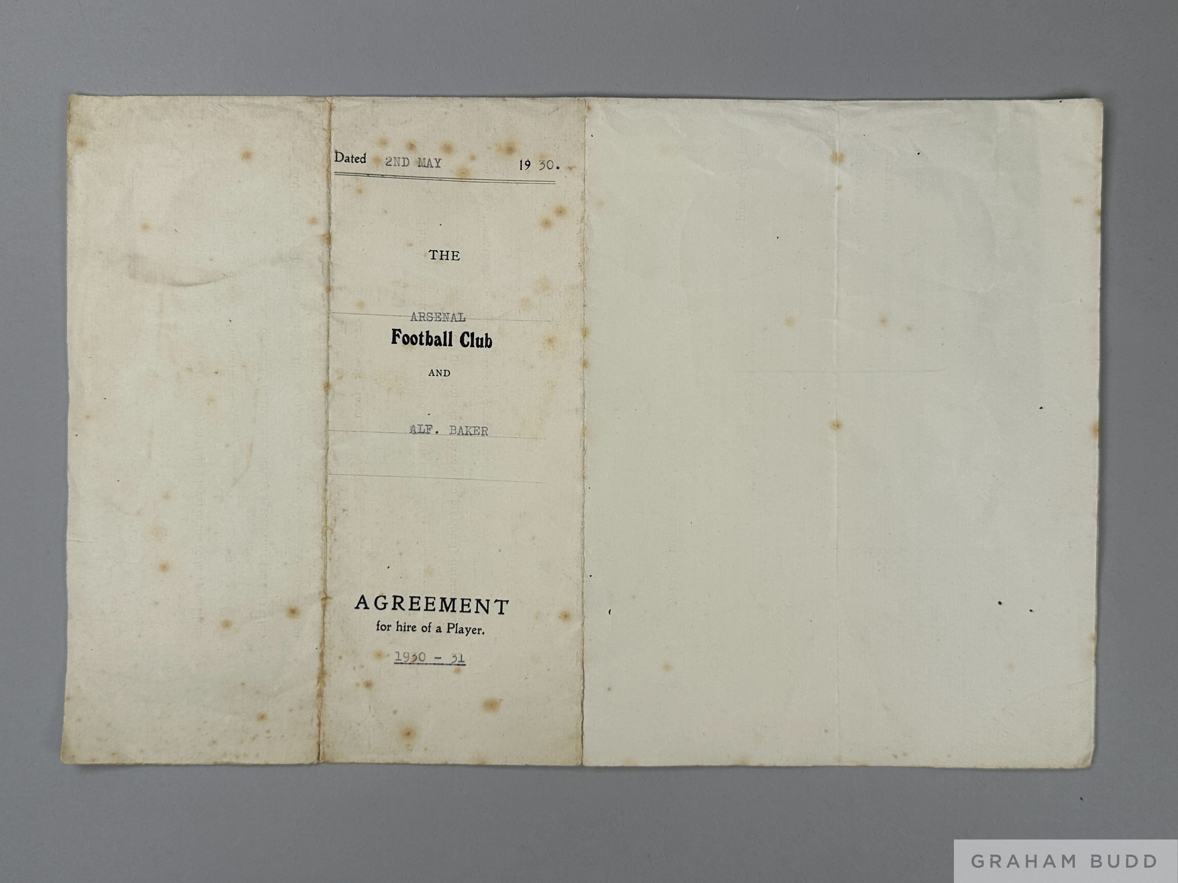Alf Baker's, last-ever Arsenal players contract, dated 2nd May 1930 for his last season and Arsenal before retiring, signed by Alf Baker and manager