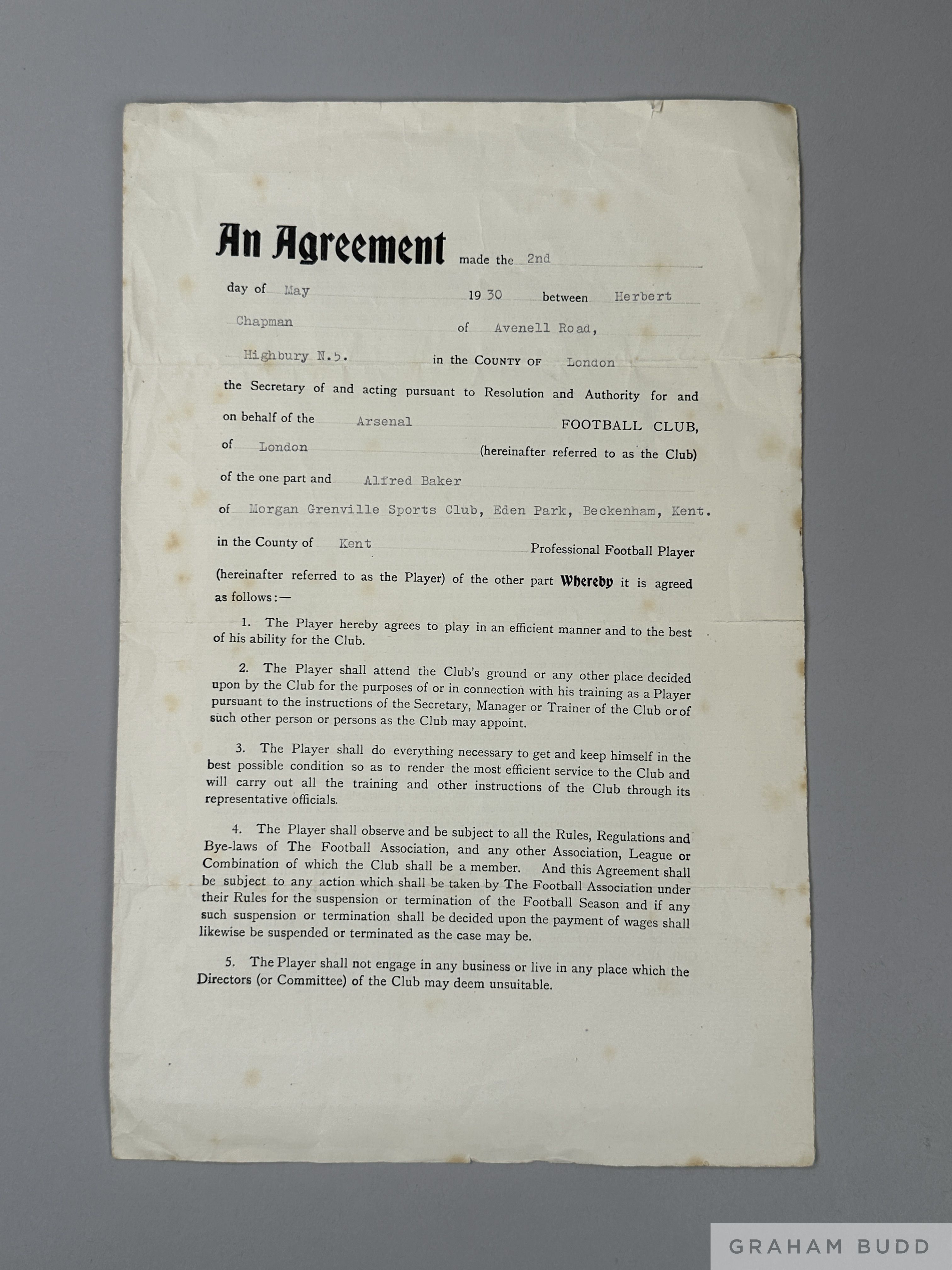 Alf Baker's, last-ever Arsenal players contract, dated 2nd May 1930 for his last season and Arsenal before retiring, signed by Alf Baker and manager Herbert Chapman, folds, some tears at folds