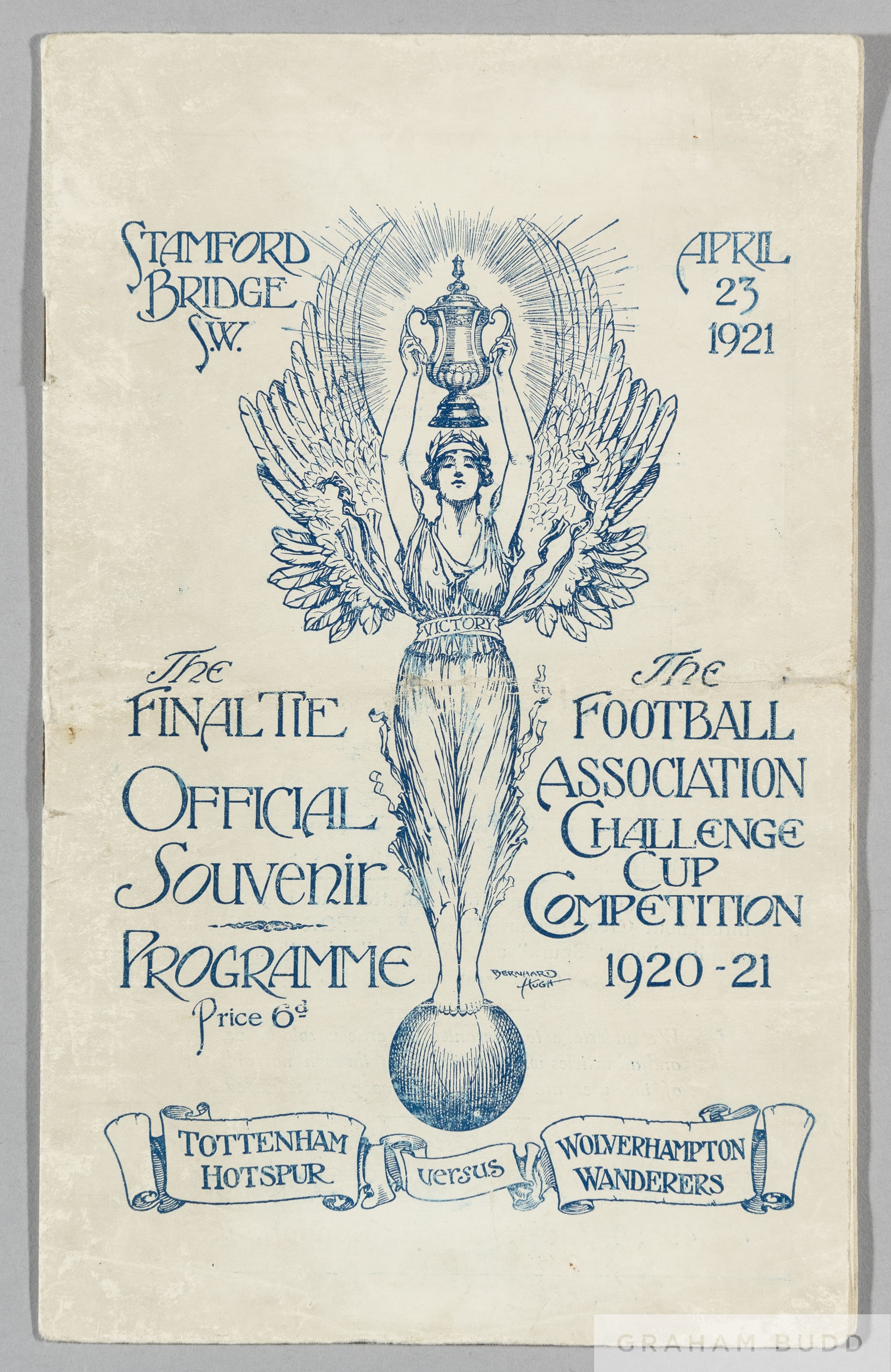 Tottenham Hotspur v. Wolverhampton Wanderers F.A. Cup Final match programme, 23rd April 1921 at Stamford Bridge The programme is in overall very good condition with some evidence of a central fold that is more visible on the pages side as opposed to the spine, and on the back cover. There is minimal sign of rust ingression around the staples and there are the usual age and gentle handling related patina to the cover. The game was the second English Cup Final played at Stamford Bridge following the end of World War one and saw Wolverhampton Wanderers of the second Division take on Tottenham Hotspur of Division One. Spurs won the game by one goal to nil in front of a crowd of over 72,000.
