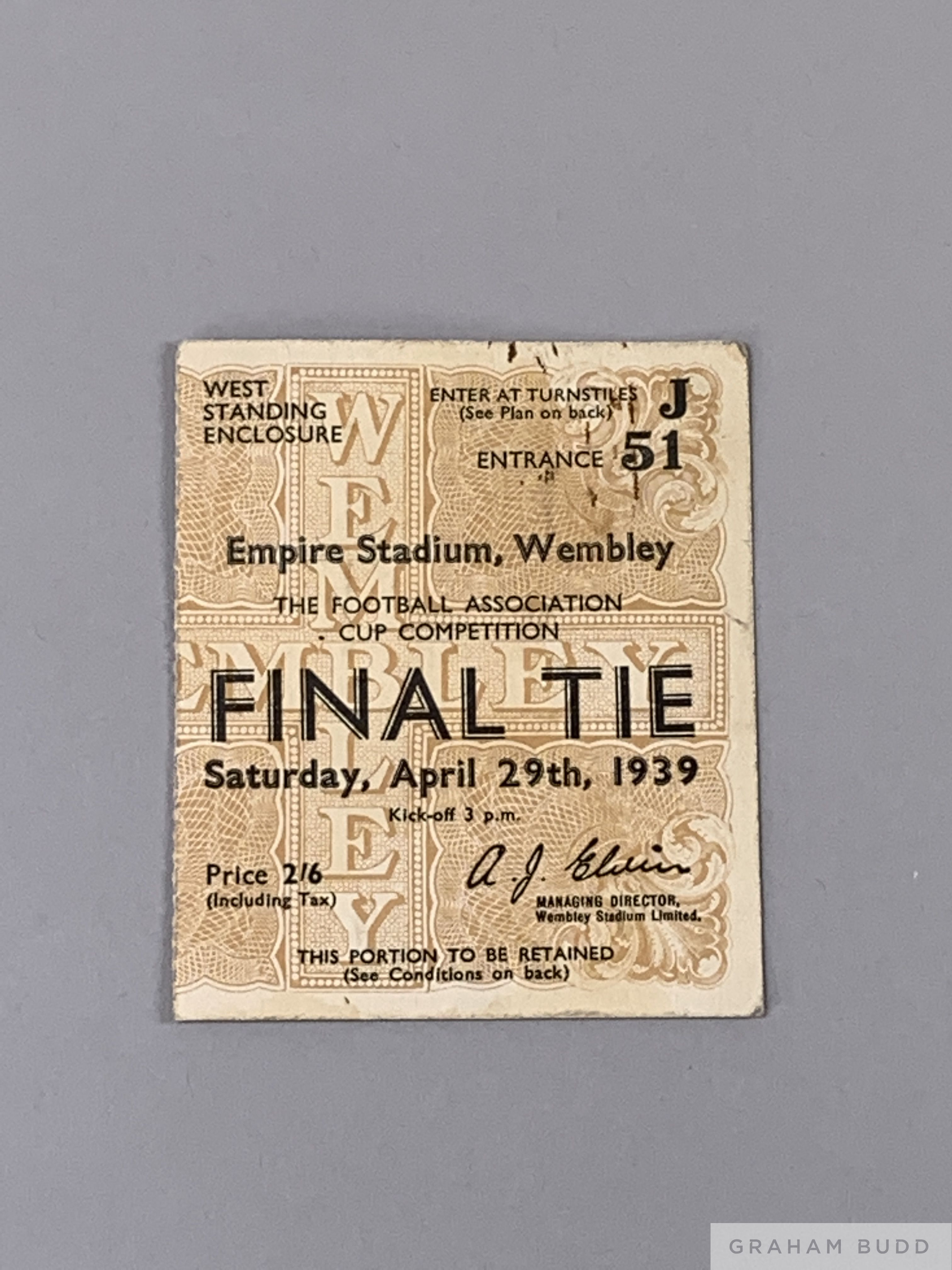 F.A. Cup Final programme Portsmouth v Wolverhampton Wanderers, played at Wembley Stadium, 29th April 1939 24-page, rust staple marks, overall fair with ticket stub (2)