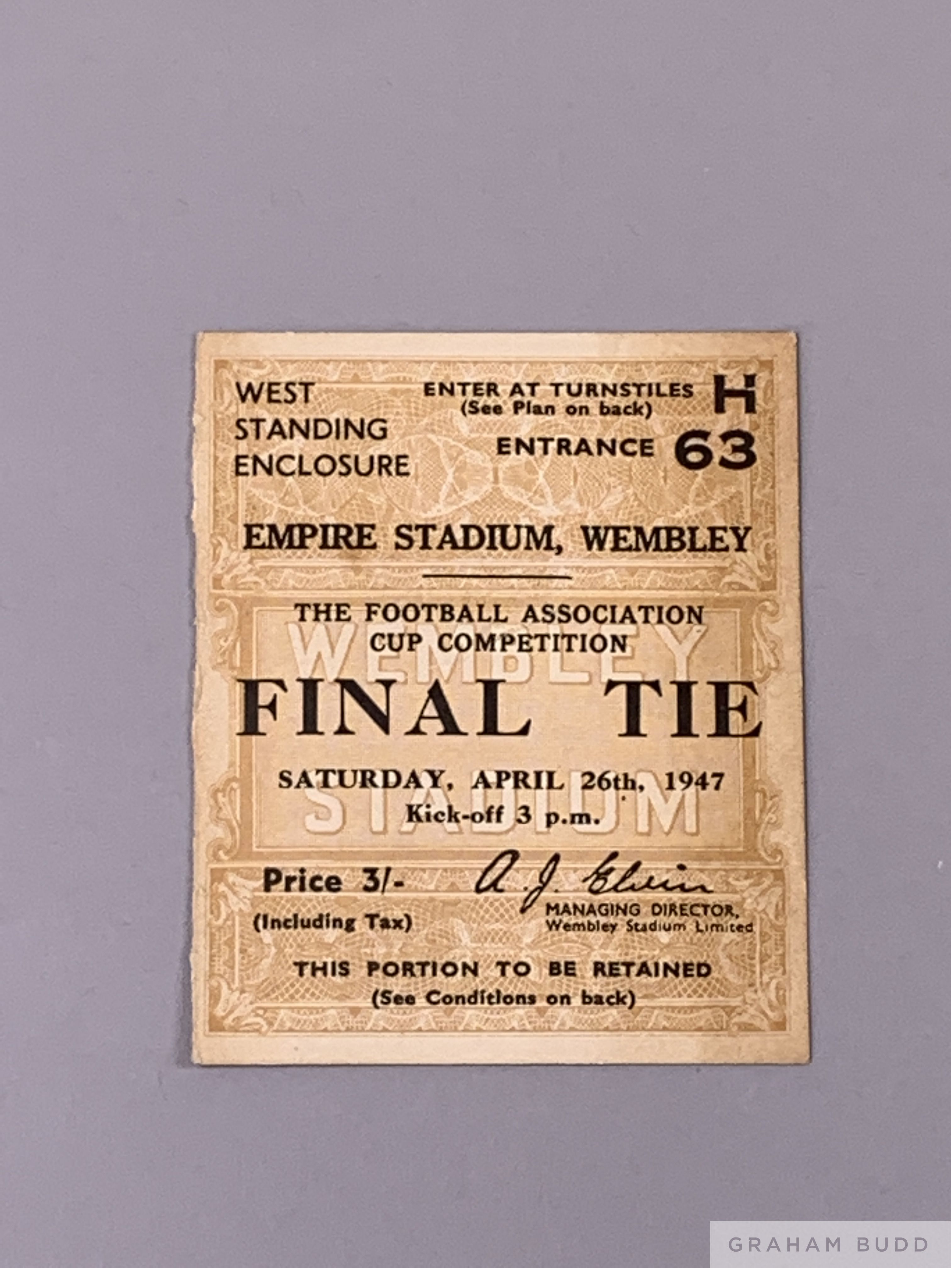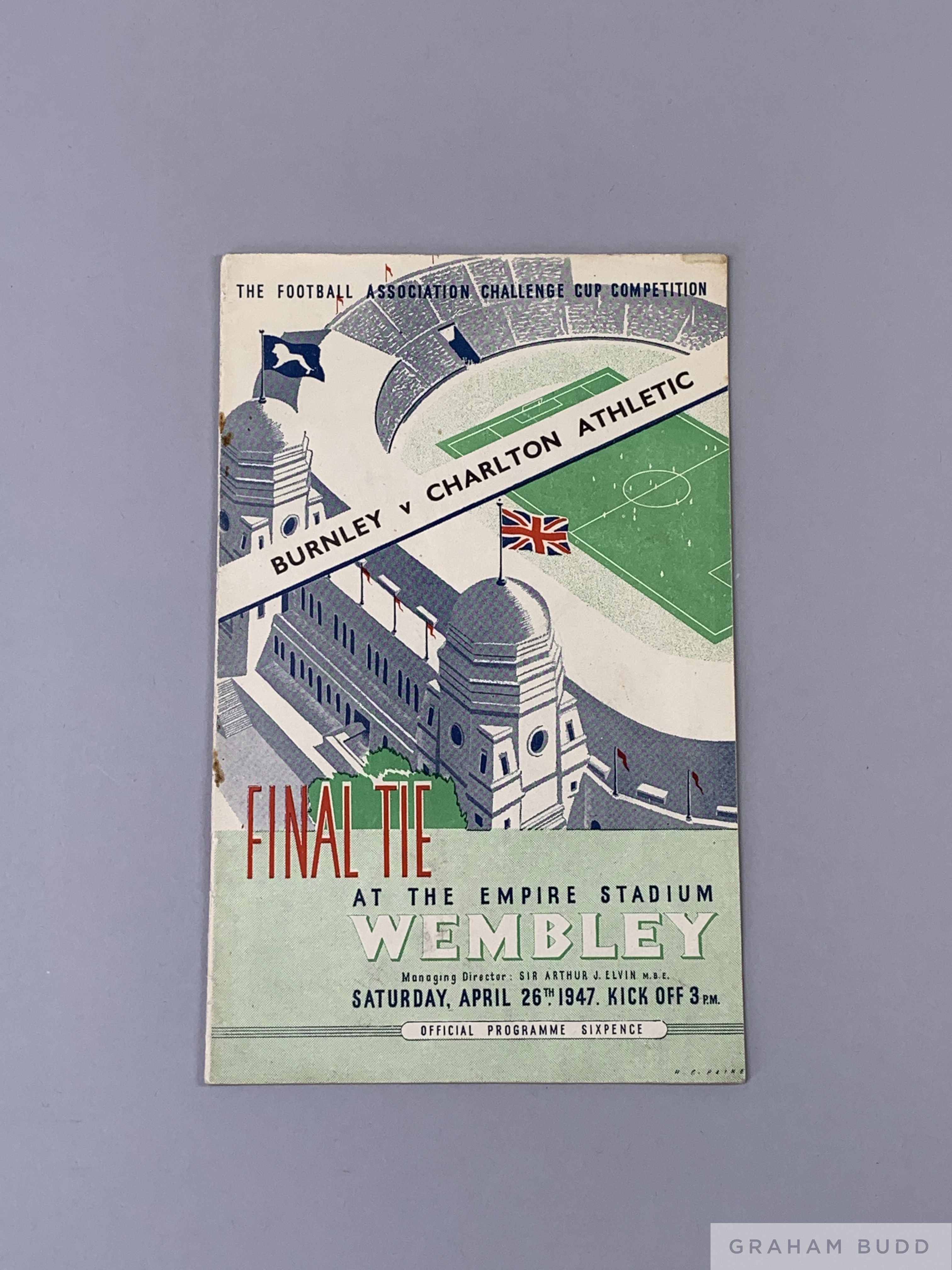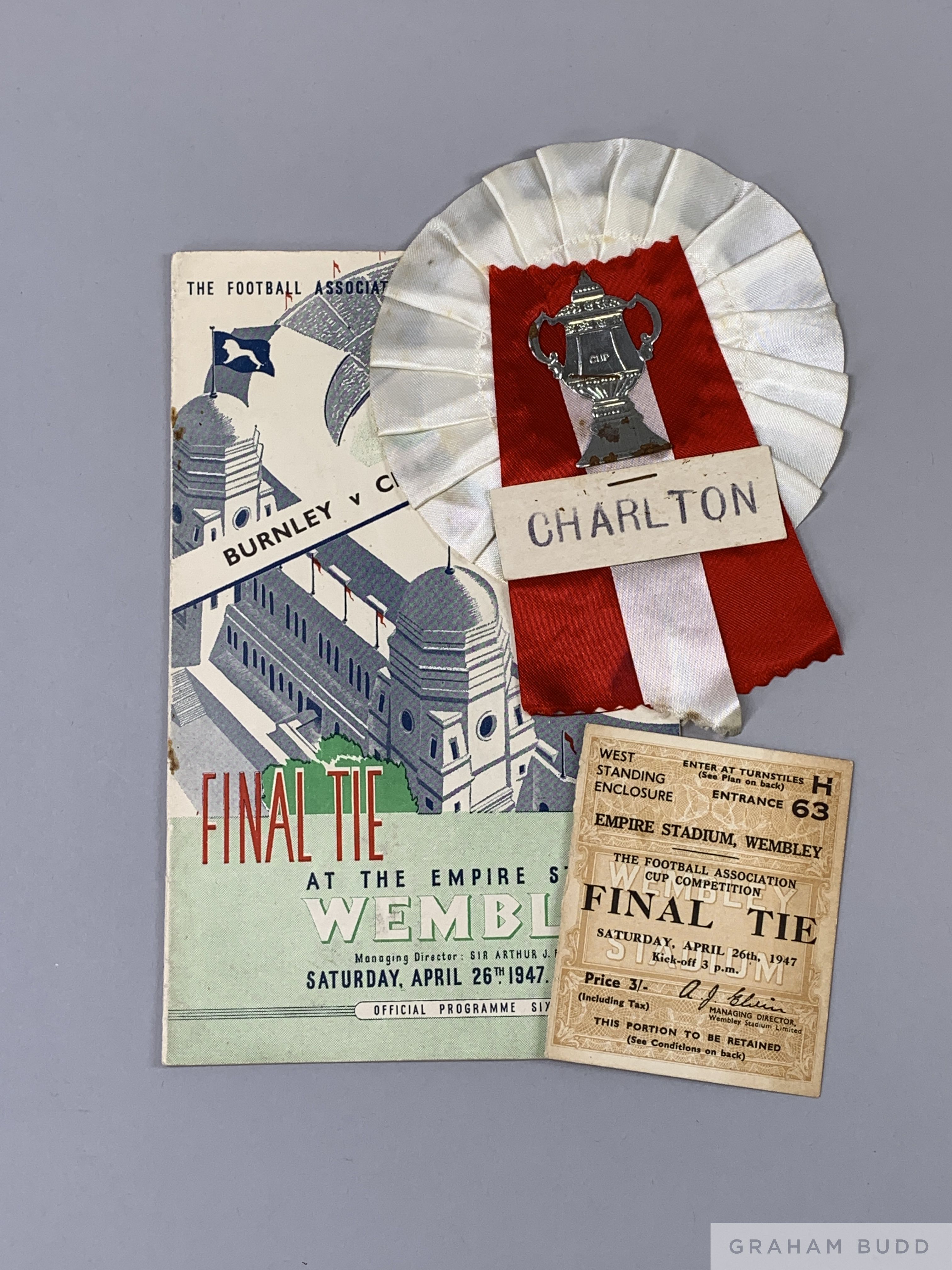 F.A. Cup Final programme Burnley v. Charlton Athletic played at Wembley, 26th April 1947 some slight cover staining with ticket stub and Charlton rosette (3)