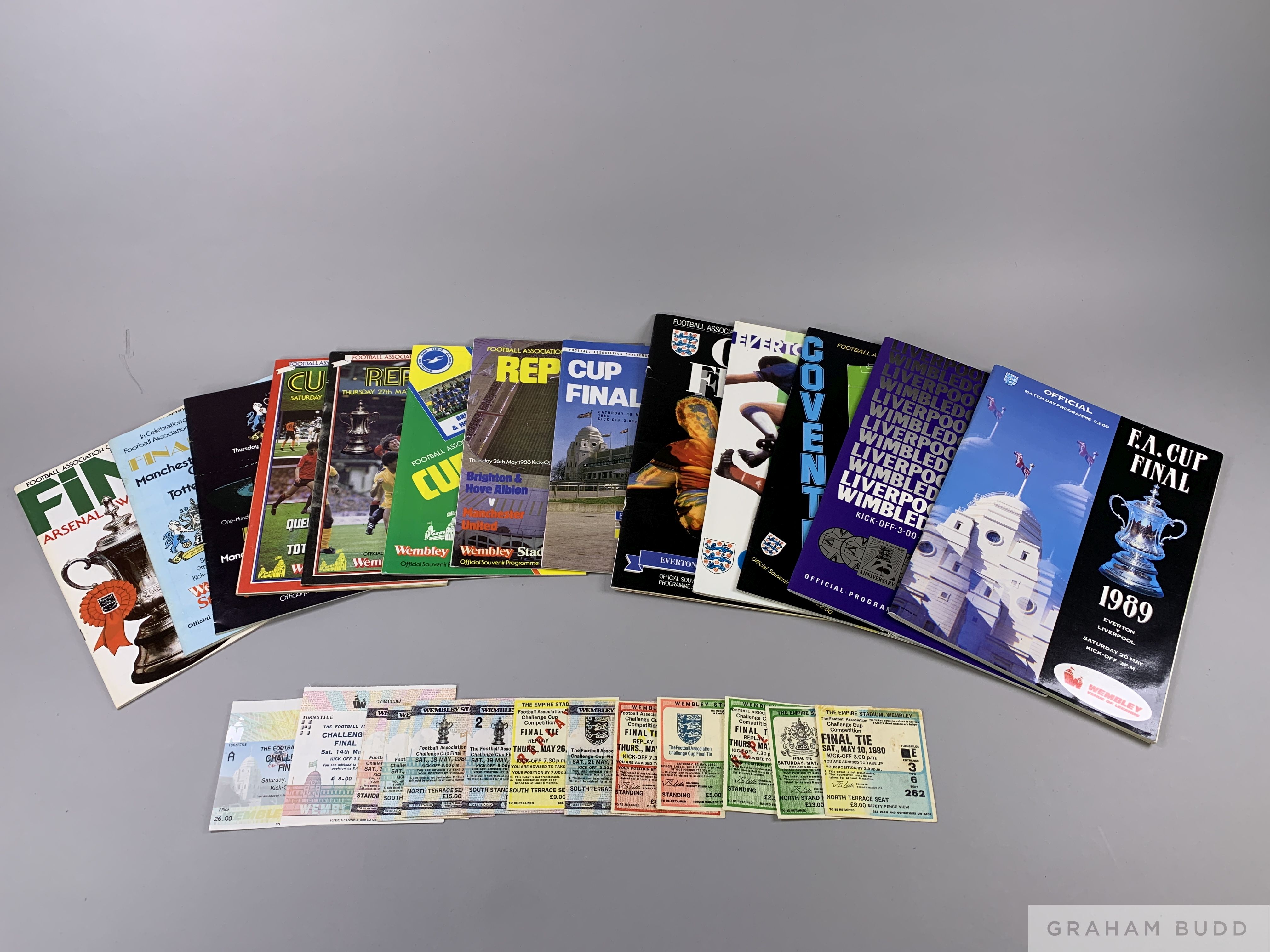 A run of ten F.A. Cup Final programmes, 1980 to 1989 all played at Wembley with replays and all with ticket stubs and some with rosettes (a lot)
