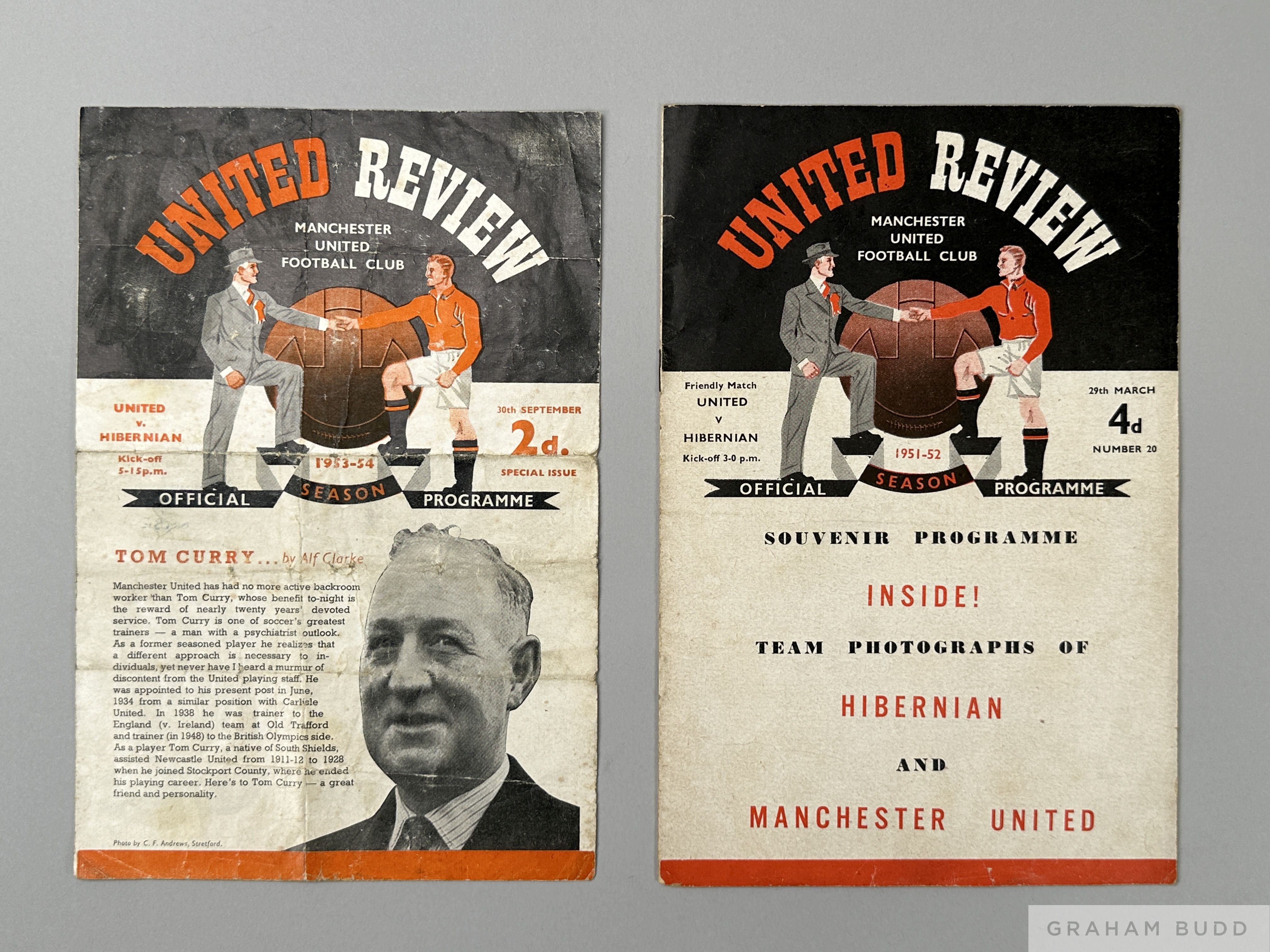 Two Manchester United v. Hibernian match programme, 1952 and 1953 29th March 1952, signs of fold and 30th September 1953, folds and text team changes
