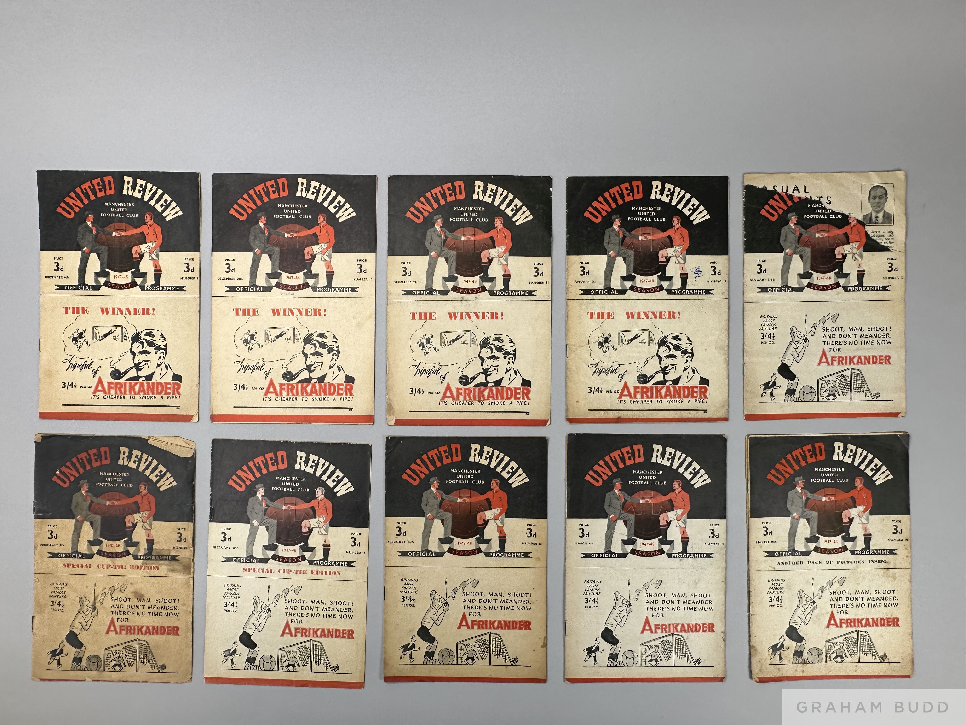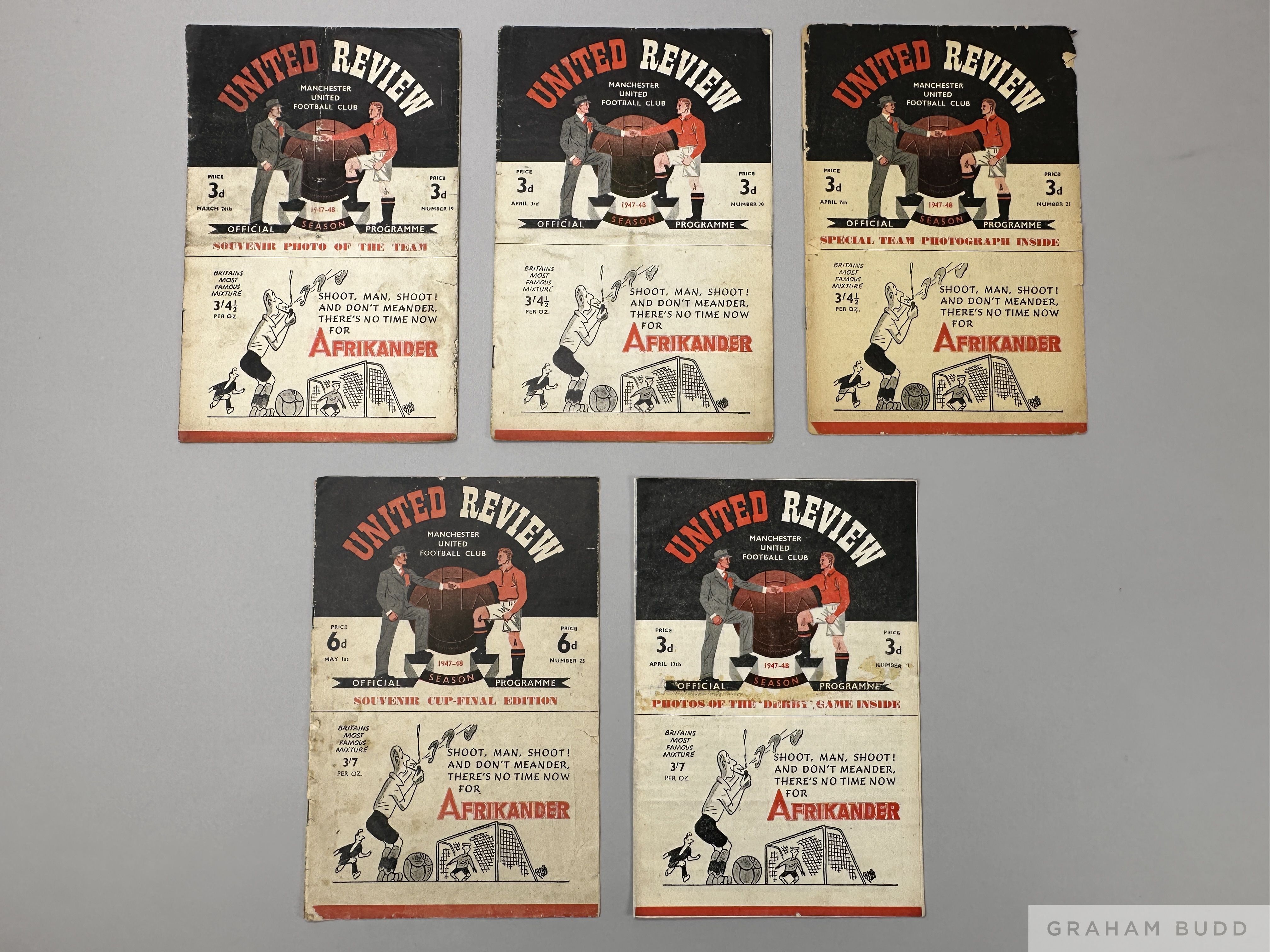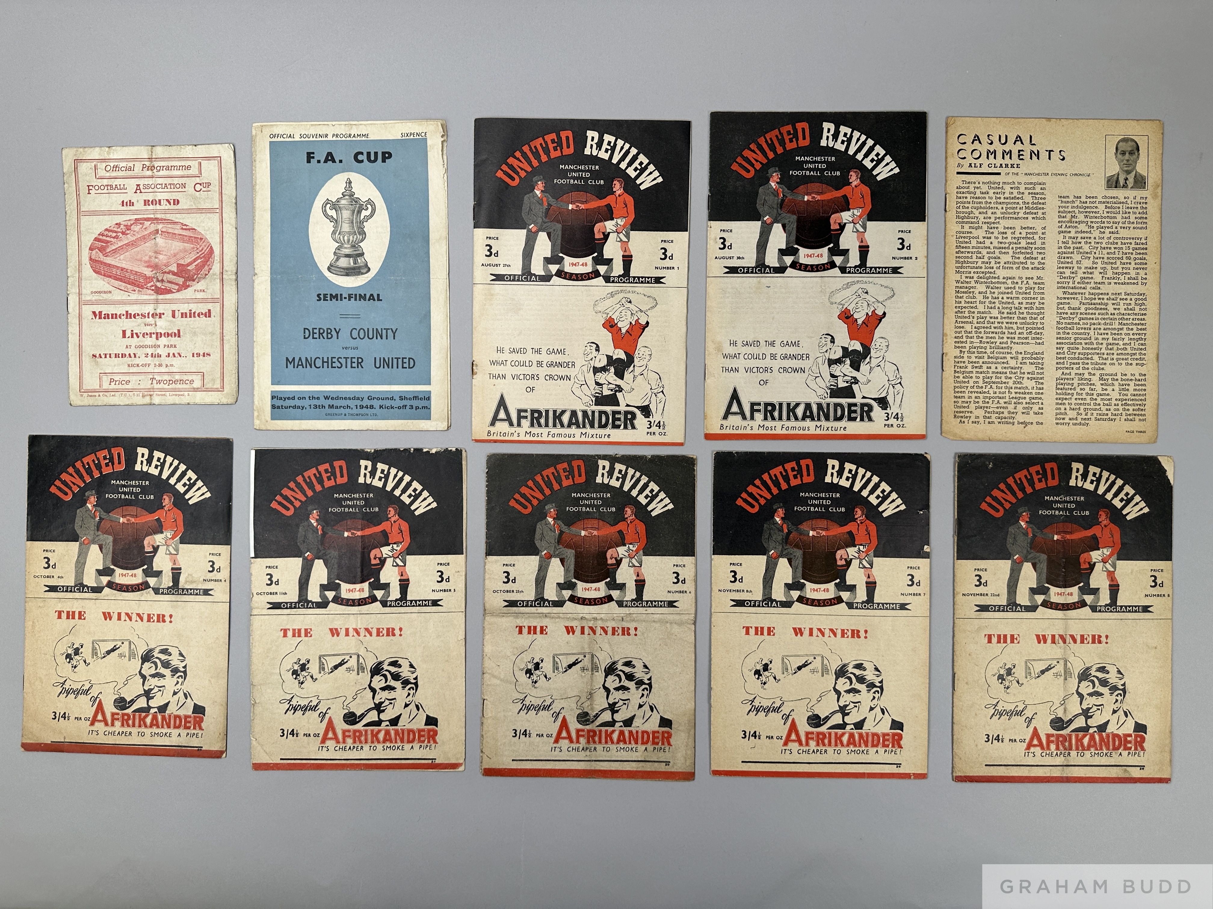 Complete run of Manchester United home league match programmes, 1947-48 and Manchester United v. Liverpool, F.A.Cup 4th Round, 24th January 1948 at Goodison Park and Derby County v. Manchester United, F.A.Cup Semi-Final, 13th March 1948, (qty)