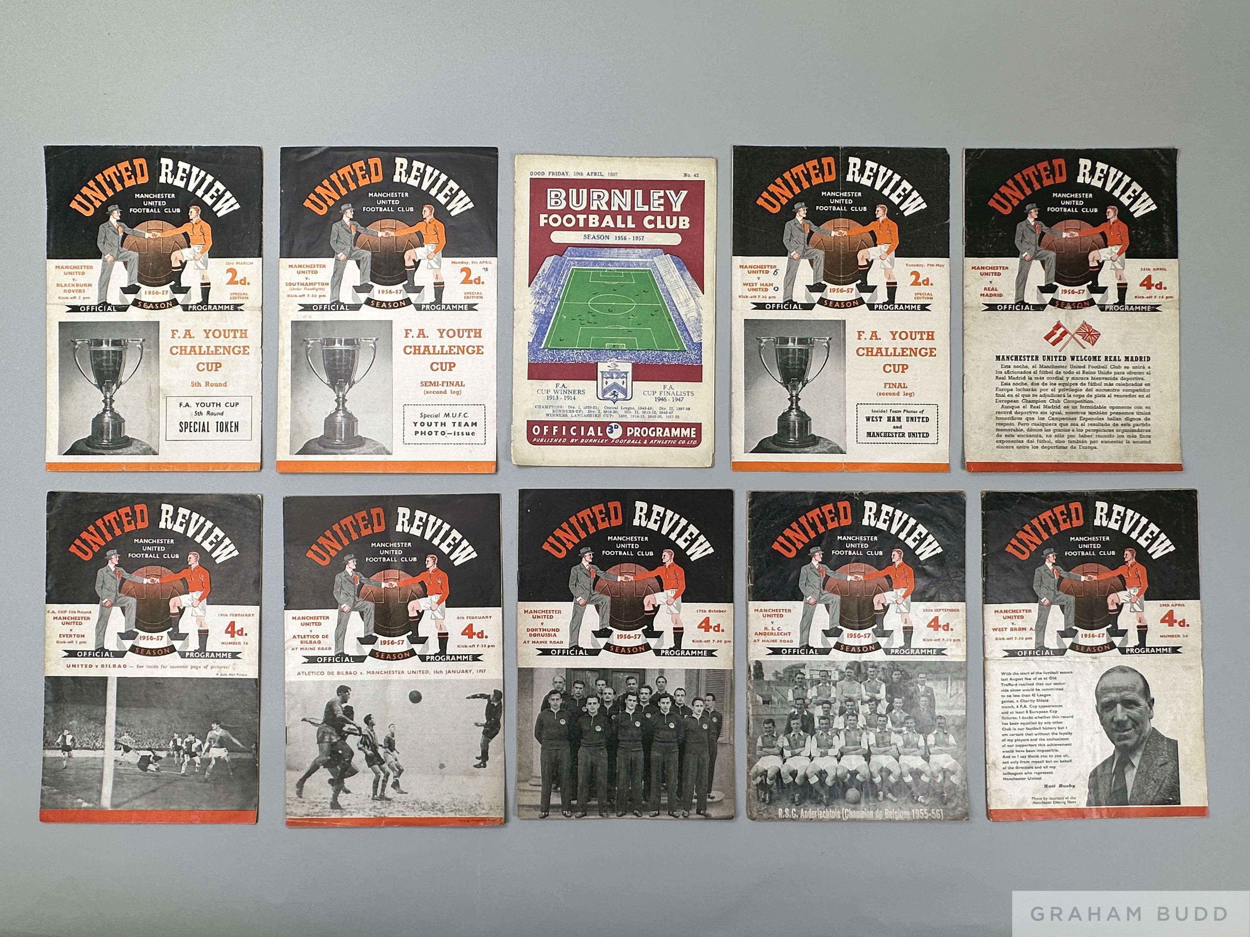 Complete run of Manchester United home league match programmes, 1956-57 including R.S.C. Anderlecht, 26th September, Borussia Dortmund, 17th October, Atletico Bilbao, 6th February, at Maine Road, Everton, F.A.Cup 5th Round, 16th February, Real Madrid, 25th April, Blackburn Rovers, Youth Cup, 23rd March, West Ham United, Youth Cup, 7th May, Southampton, 8th April and Burnley v. Manchester United, 19th April 1957 (30)