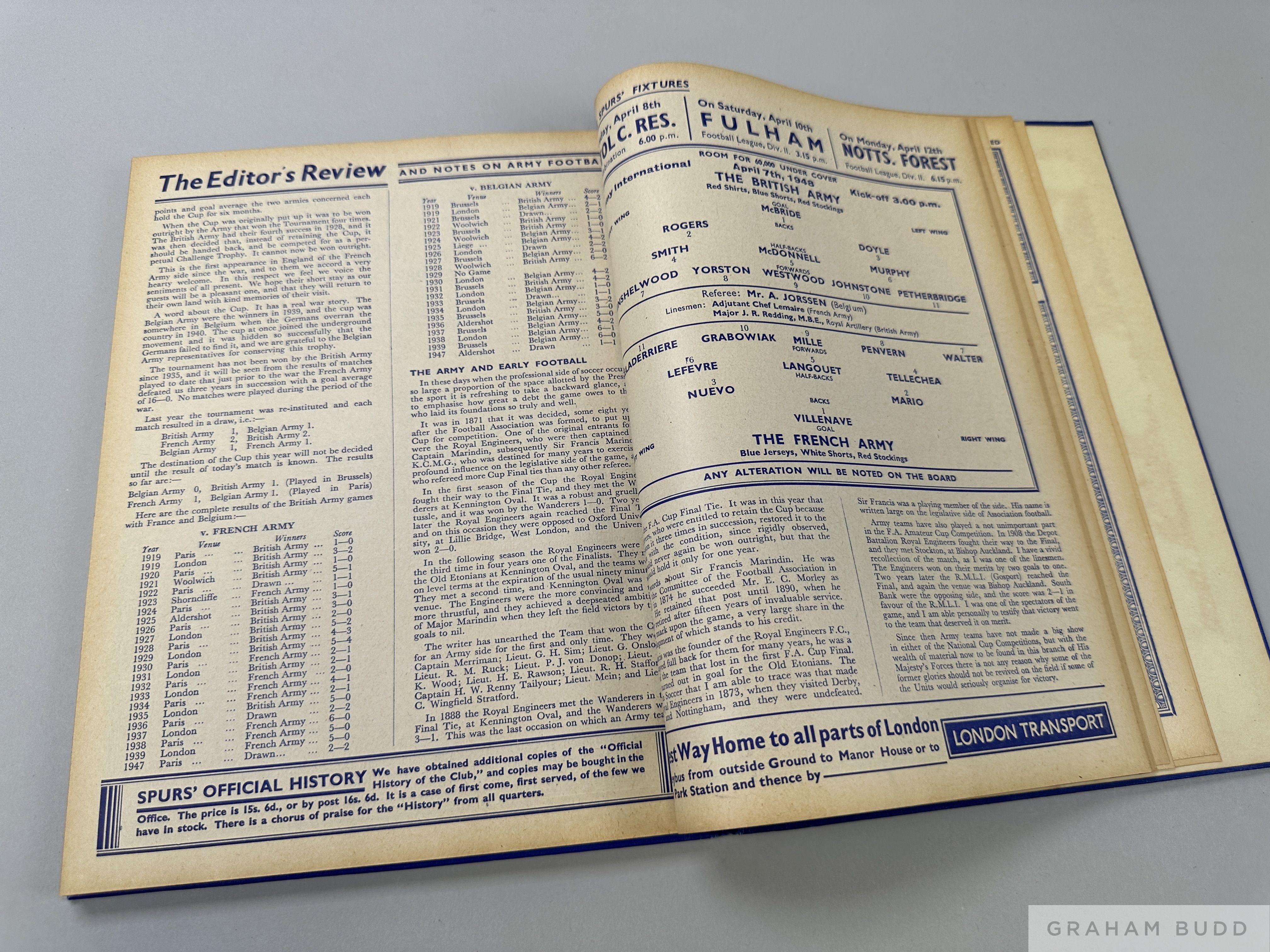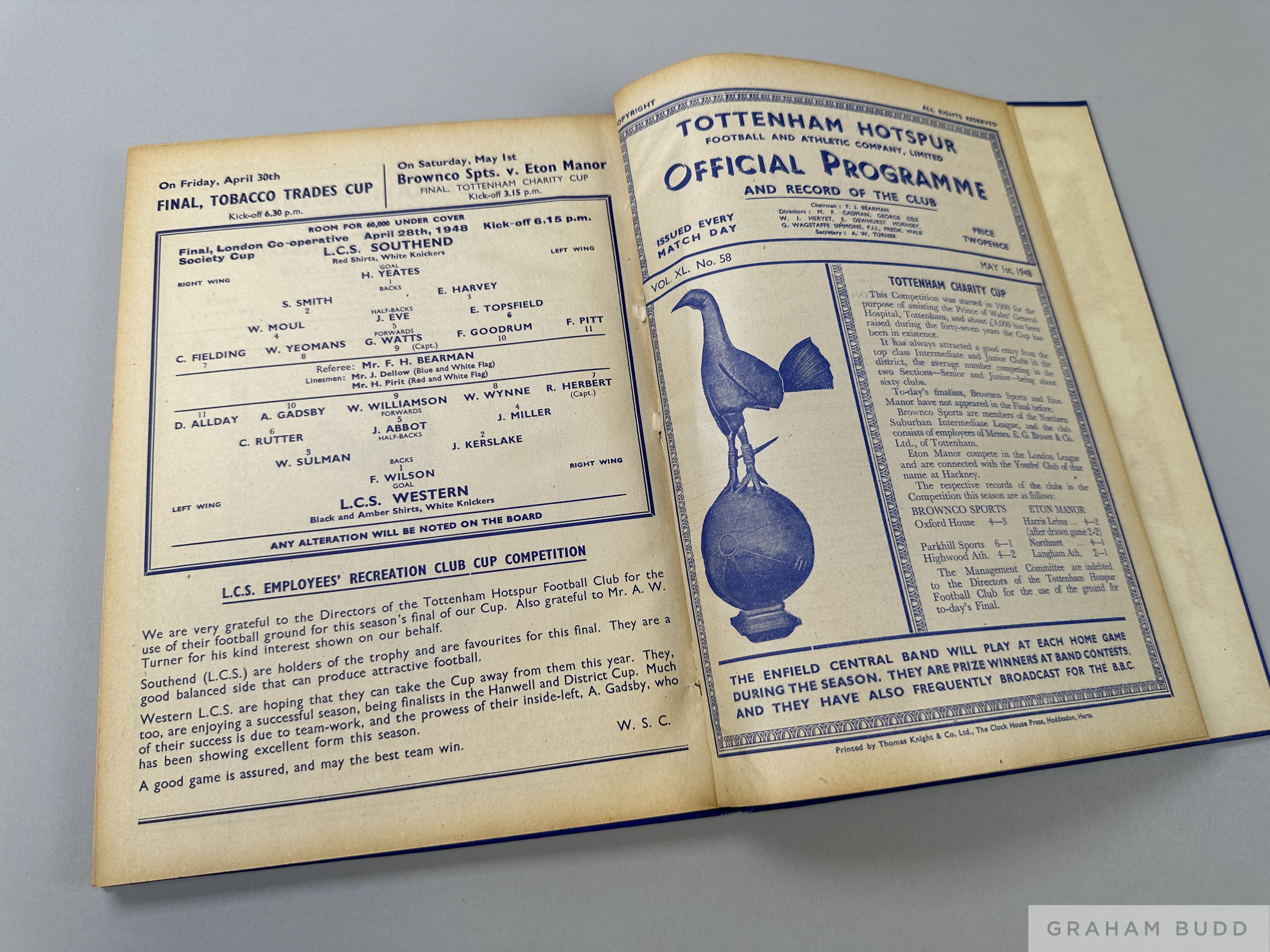 Bound volume of Tottenham Hotspur match programmes, season 1947-48 Vol. XL., No.1, Whites v. Reds, 9th August to Vol. XL. No..58, Brownco Sports v. Eton Manor, Tottenham Charity Cup, Senior Final, 1st May including League, Reserves, F.A.Cup and representative matches etc in blue covers Tottenham Hotspur 1947-48, Match Programmes