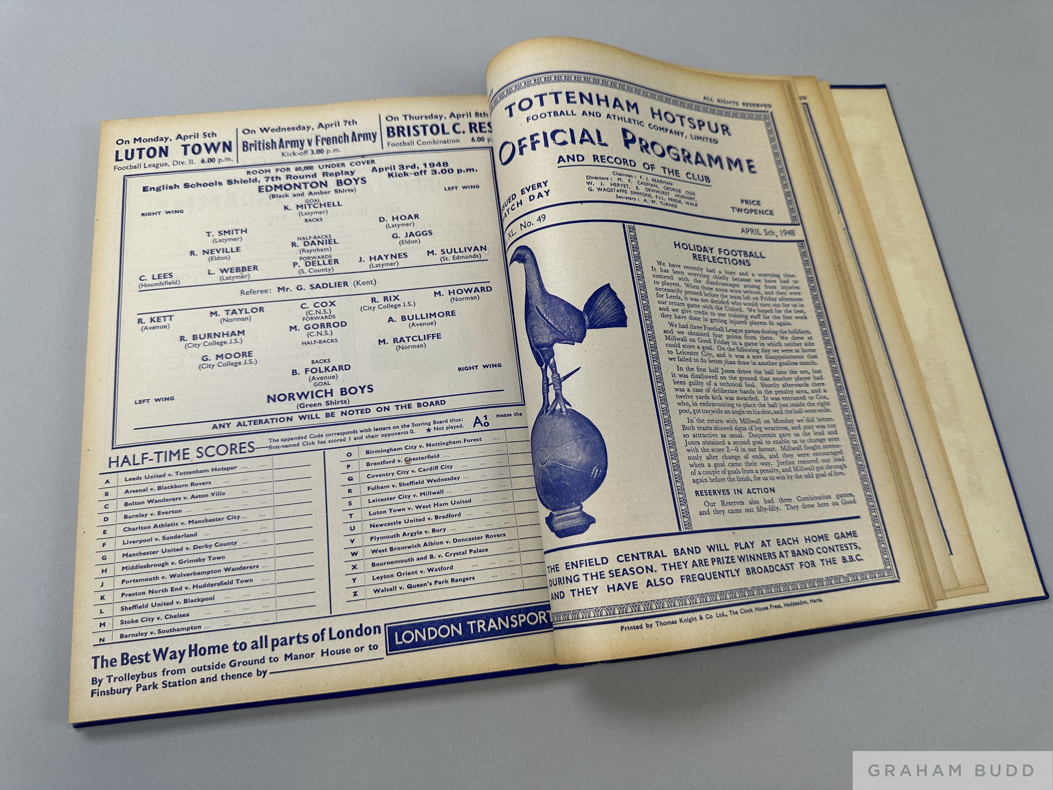 Bound volume of Tottenham Hotspur match programmes, season 1947-48 Vol. XL., No.1, Whites v. Reds, 9th August to Vol. XL. No..58, Brownco Sports v. E
