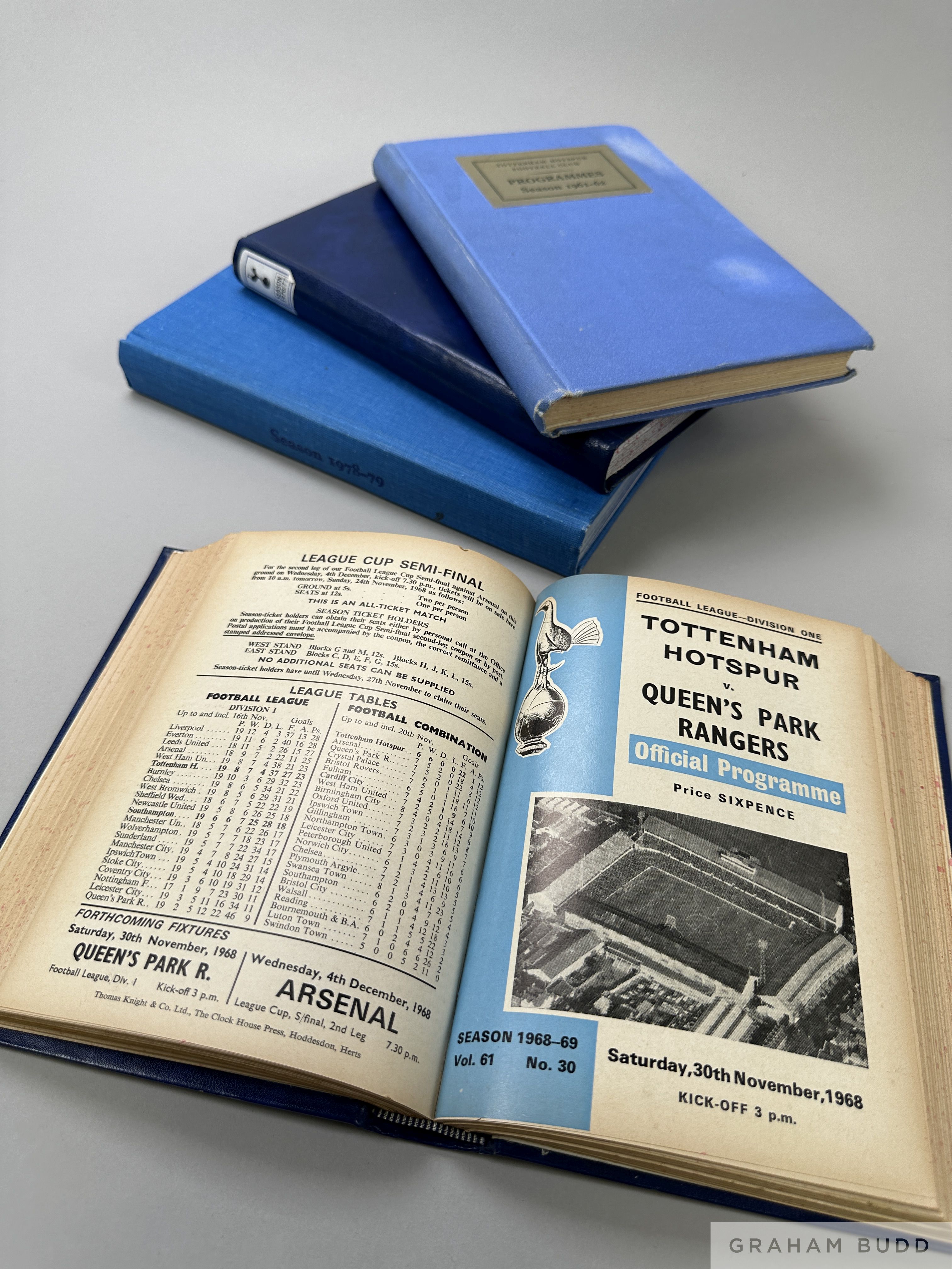 Four bound volumes of Tottenham Hotspur home match programmes comprising 1961-62; 1968-69, 1976-77; and 1978-79 including Tottenham Hotspur v. Queens Park Rangers, postponed match programme, 30th November 1968, (4)