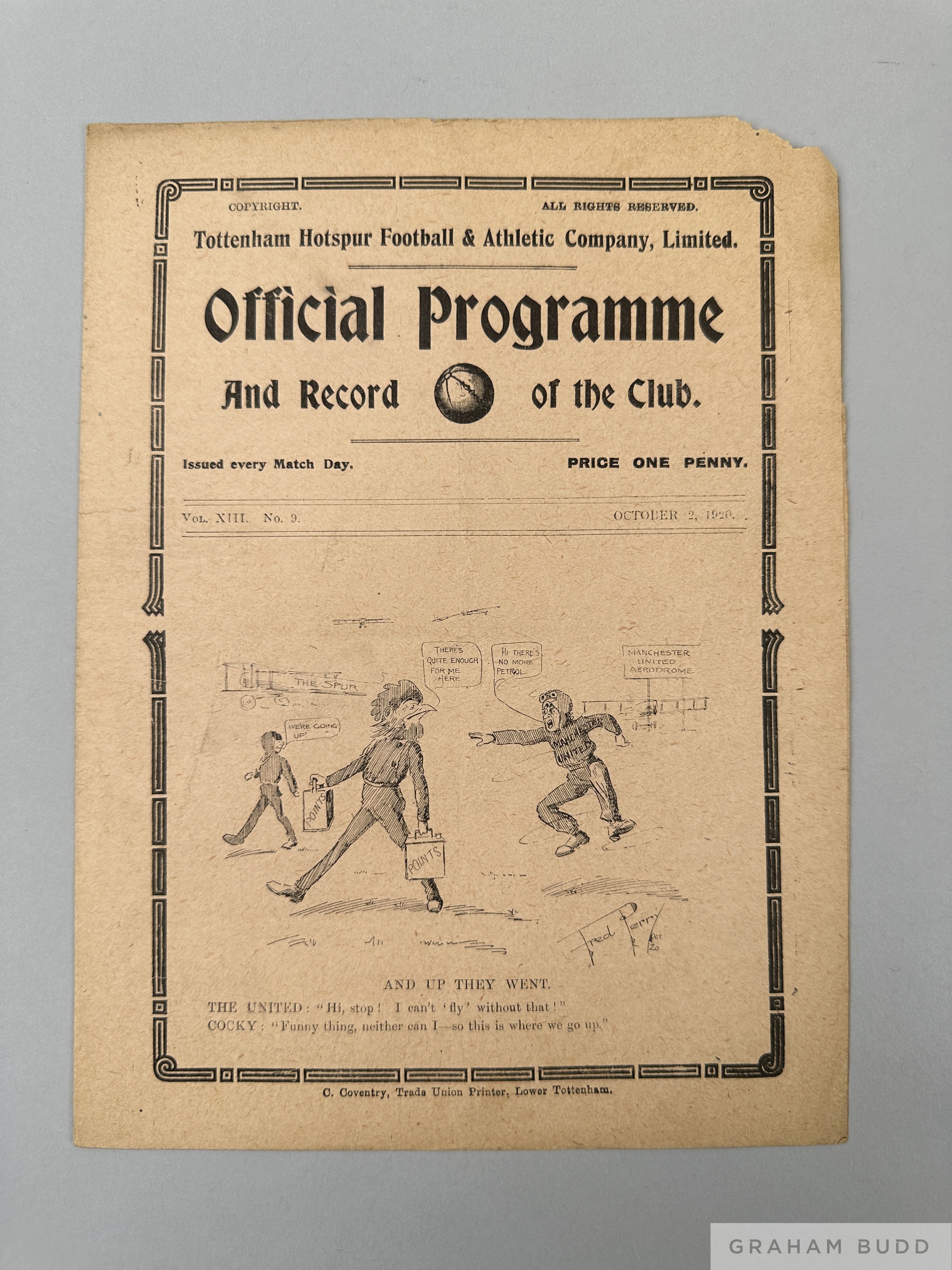 Tottenham Hotspur v. Manchester United, home match programme, 2nd October 1920 Signs of folds, pencil text on team page